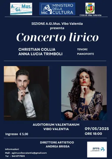Il concerto è organizzato con il patrocinio del ministero della Cultura e il Comune di Vibo Valentia e «rappresenta un’occasione preziosa per celebrare la grande tradizione lirica in un’atmosfera di intima condivisione artistica e culturale. La stagione concertistica della Sezione A.gi.mus. Vibo Valentia continua a puntare sulla maestria artistica offrendo, ai giovani talenti calabresi, occasioni e spazi per esibirsi». L’evento si terrà venerdì 9 maggio alle ore 18 all’Auditorium del Valentianum di Vibo Valentia.