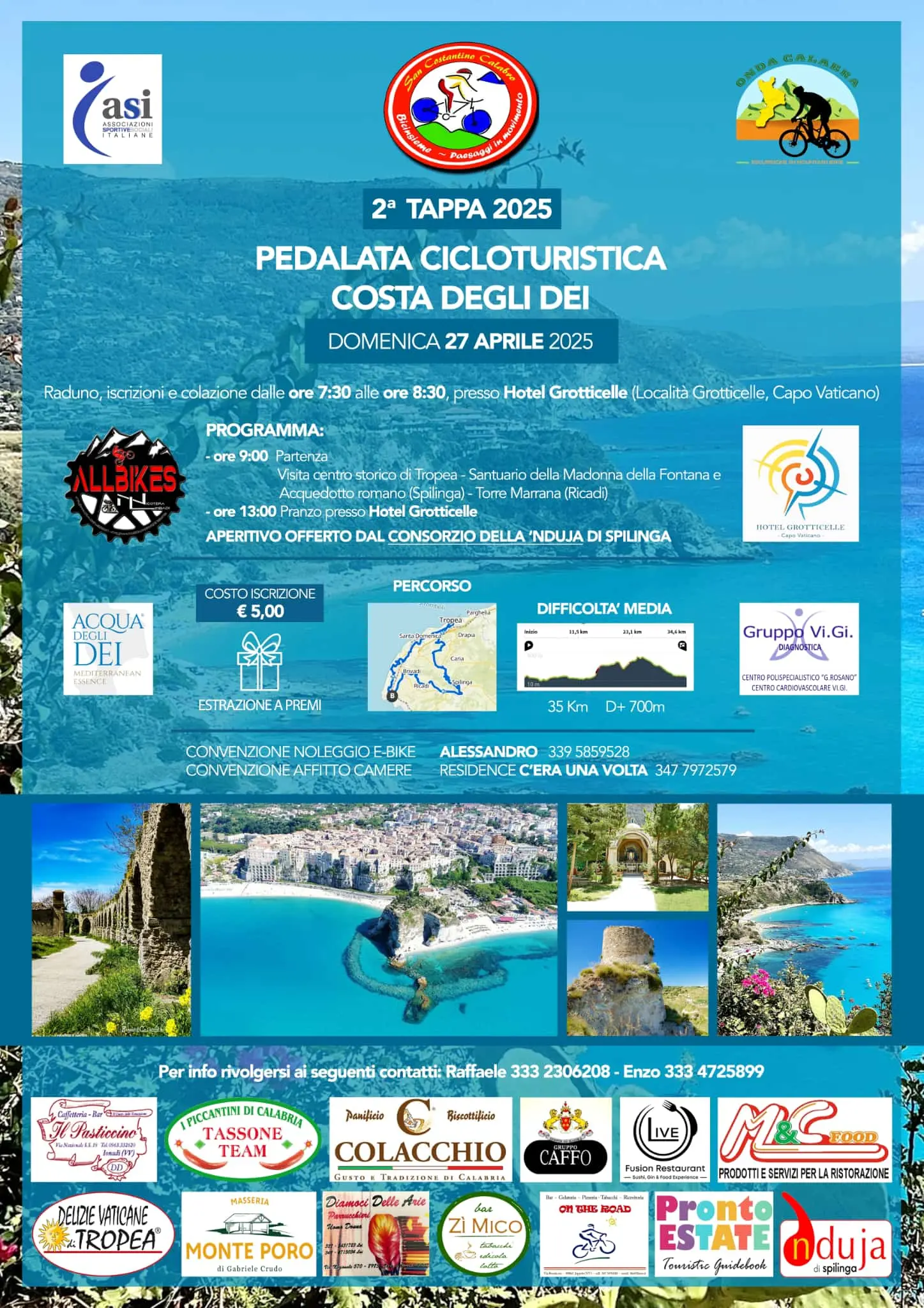 La seconda tappa dei raduni itineranti in bicicletta “Onda Calabra” prenderà il via alle 9 dalla Baia di Grotticelle di Capo Vaticano. Successivamente i partecipanti raggiungeranno Tropea per ammirare il centro storico, per poi attraversare le colline circostanti e concludere la loro corsa a Spilinga, comunità famosa per la ‘Nduja. Qui i cicloamatori faranno visita al santuario della Madonna della Fontana e all’acquedotto romano e usufruiranno di un aperitivo offerto dal locale Consorzio a tutela del rinomato prodotto tipico. A seguire ritorneranno nel luogo di partenza per visitare la zona archeologica e la Torre Marrana. A degna conclusione del raduno itinerante gli organizzatori hanno previsto un pranzo conviviale per tutti i partecipanti, momento propizio per ritrovarsi e condividere insieme idee e progetti di sana aggregazione sociale dopo le fatiche e le gioie della giornata.