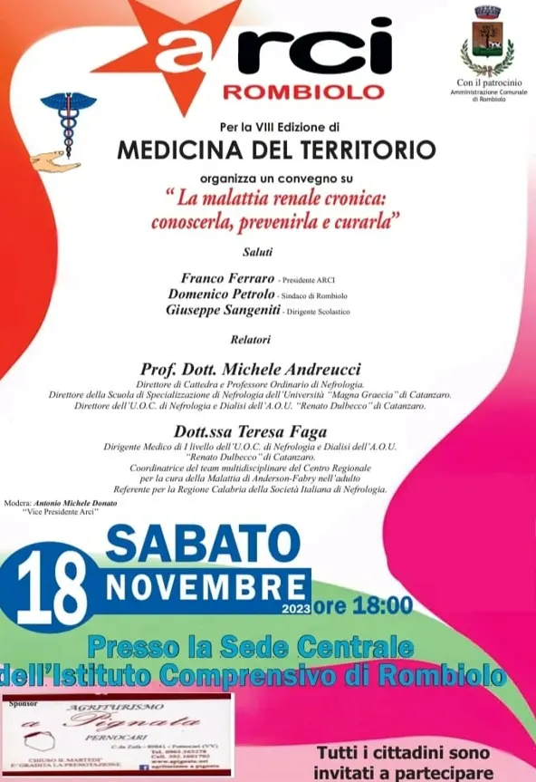 “La malattia renale cronica: conoscerla, prevenirla e curarla”. Questo il tema dell’incontro in programma a Rombiolo nella sede centrale dell’Istituto comprensivo. L’appuntamento, fortemente voluto dall’associazione Arci, rientra nella VIII edizione di Medicina del territorio. Il convegno, moderato dal vice presidente Arci Michele Donato, si aprirà con i saluti di Franco Ferrari, presidente Arci; Domenico Petrolo, sindaco di Rombiolo; Giuseppe Sangineti, dirigente scolastico. Relazioneranno: Michele Andreucci, direttore di Cattedra e professore ordinario di Nefrologia e Teresa Faga, dirigente medico di primo livello dell’Unità operativa complessa di Nefrologia e dialisi della Aou Renato Dulbecco di Catanzaro. L’evento, che gode del patrocinio dell’amministrazione comunale di Rombiolo, è in programma il 18 novembre dalle ore 18.00. I promotori invitano i cittadini a partecipare.