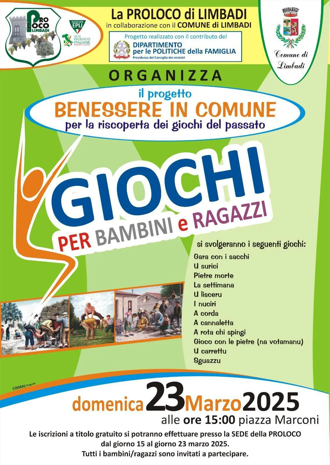 La gara coi sacchi o “a rota chi spingi”. Sono alcune antiche attività ludiche che saranno i protagonisti dell’iniziativa sociale “Benessere in comune per la riscoperta dei giochi del passato” in programma il 23 marzo alle ore 15.00 in piazza Marconi a Limbadi. Il progetto è portato avanti dalla Pro loco di Limbadi in collaborazione con il Comune e punta a promuovere la socialità e i valori sani dello sport. L’appuntamento è stato pensato soprattutto per i bambini e i ragazzi. Proprio per questo verranno riproposti giochi come “a corda”, “u surici”, “i nuciri”, “u lisceru”, pietre morte, gioco con le pietre, sgazzu, la settimana. Le iscrizioni, a titolo gratuito, si potranno effettuare presso la sede Pro loco fino al 23 marzo.
