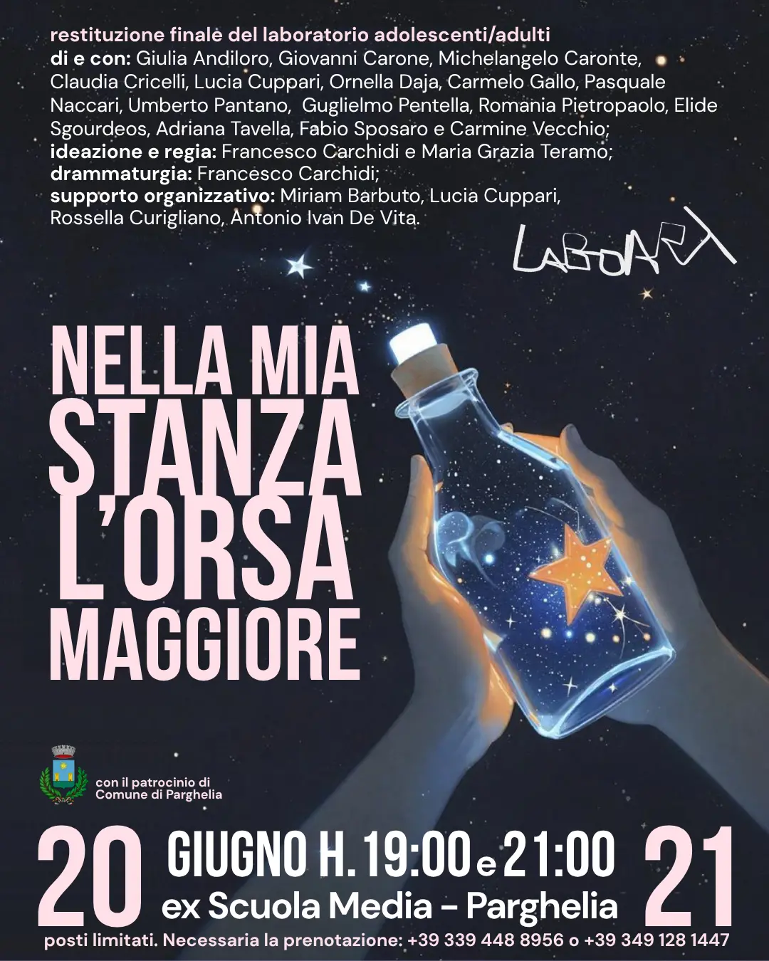 Il 20 e il 21 giugno si chiude l’anno delle attività formative di LaboArt per il 2024/25. L’associazione, che dal 2010 opera nella provincia di Vibo Valentia promuovendo il teatro come strumento di crescita e inclusione, presenterà l’esito di fine laboratorio “Nella mia stanza l’Orsa maggiore”. «Lo spettacolo – si legge nel comunicato stampa dell’associazione – segna la conclusione del percorso di teatro di comunità per il gruppo adolescenti-adulti. Sarà un’esperienza di teatro itinerante che trasformerà l’ex scuola media di Parghelia in uno spazio di condivisione delle emozioni. Lo spettacolo andrà in scena il 20 e il 21 giugno in doppia replica, alle ore 19 e alle 21, nell’ex scuola media di Parghelia, oggi sede del Museo della Memoria. L’evento è patrocinato dal Comune di Parghelia. Lo spettacolo si sviluppa lungo un percorso fisico ed emotivo che attraverserà stanze reali e immaginarie. In scena ci saranno gli allievi-attori: Giulia Andiloro, Giovanni Carone, Michelangelo Caronte, Claudia Cricelli, Lucia Cuppari, Ornella Daja, Carmelo Gallo, Pasquale Naccari, Umberto Pantano, Guglielmo Pentella, Romania Pietropaolo, Elide Sgourdeos, Fabio Sposaro, Adriana Tavella e Carmine Vecchio».