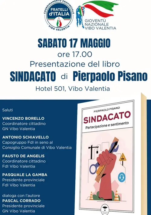 Sabato 17 maggio, alle ore 17:00, presso il 501 Hotel di Vibo Valentia, si terrà la presentazione del libro “Sindacato” di Pierpaolo Pisano, organizzata da Fratelli d’Italia e Gioventù nazionale Vibo Valentia.
