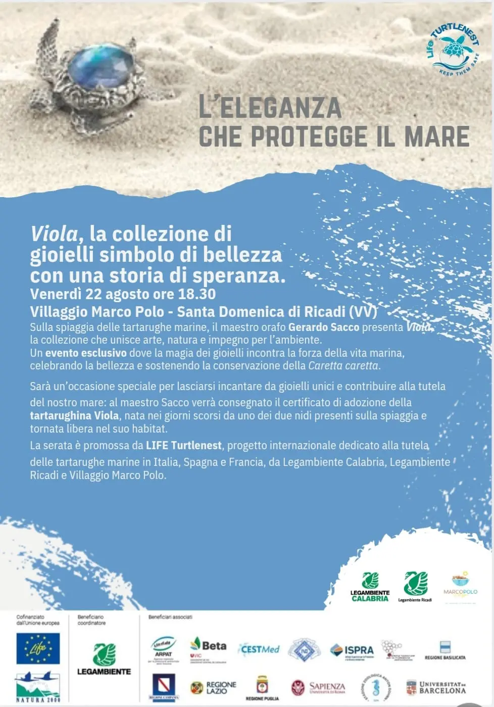 La serata è promossa nell’ambito del progetto internazionale LIFE Turtlenest, un’iniziativa dedicata alla tutela delle tartarughe marine in Italia, Spagna e Francia, supportata da Legambiente Calabria, Legambiente Ricadi e il villaggio “Marco Polo“. L’evento rappresenta un’occasione unica per il pubblico di ammirare gioielli unici e, allo stesso tempo, contribuire attivamente alla protezione del nostro mare. Un’iniziativa che unisce l’arte orafa di alta qualità all’impegno per l’ambiente, dimostrando come la bellezza possa essere uno strumento potente per veicolare un messaggio di speranza e tutela per le generazioni future.