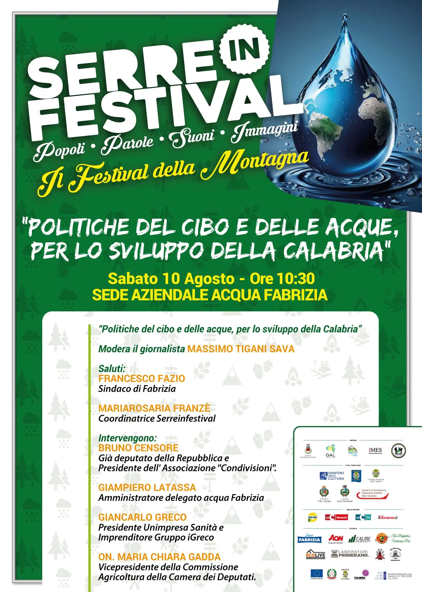 L’importanza di una sana e corretta alimentazione e della necessità di preservare le risorse che la natura offre sarà al centro della quarta giornata del “Serreinfestival”, sabato 10 agosto. Alle 10.30, nella sede aziendale dell’Acqua Fabrizia, avrà infatti luogo il convegno “Politiche del cibo e delle acque per lo sviluppo della Calabria” che sarà moderato dal giornalista Massimo Tigani Sava.