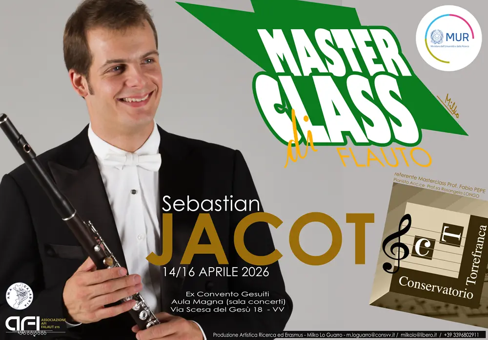 Da martedì 14 a giovedì 16 aprile il Conservatorio Statale di Musica “Fausto Torrefranca” di Vibo Valentia ospita una masterclass di flauto affidata al M° Sébastian Jacot, tra le figure più autorevoli del panorama europeo.
