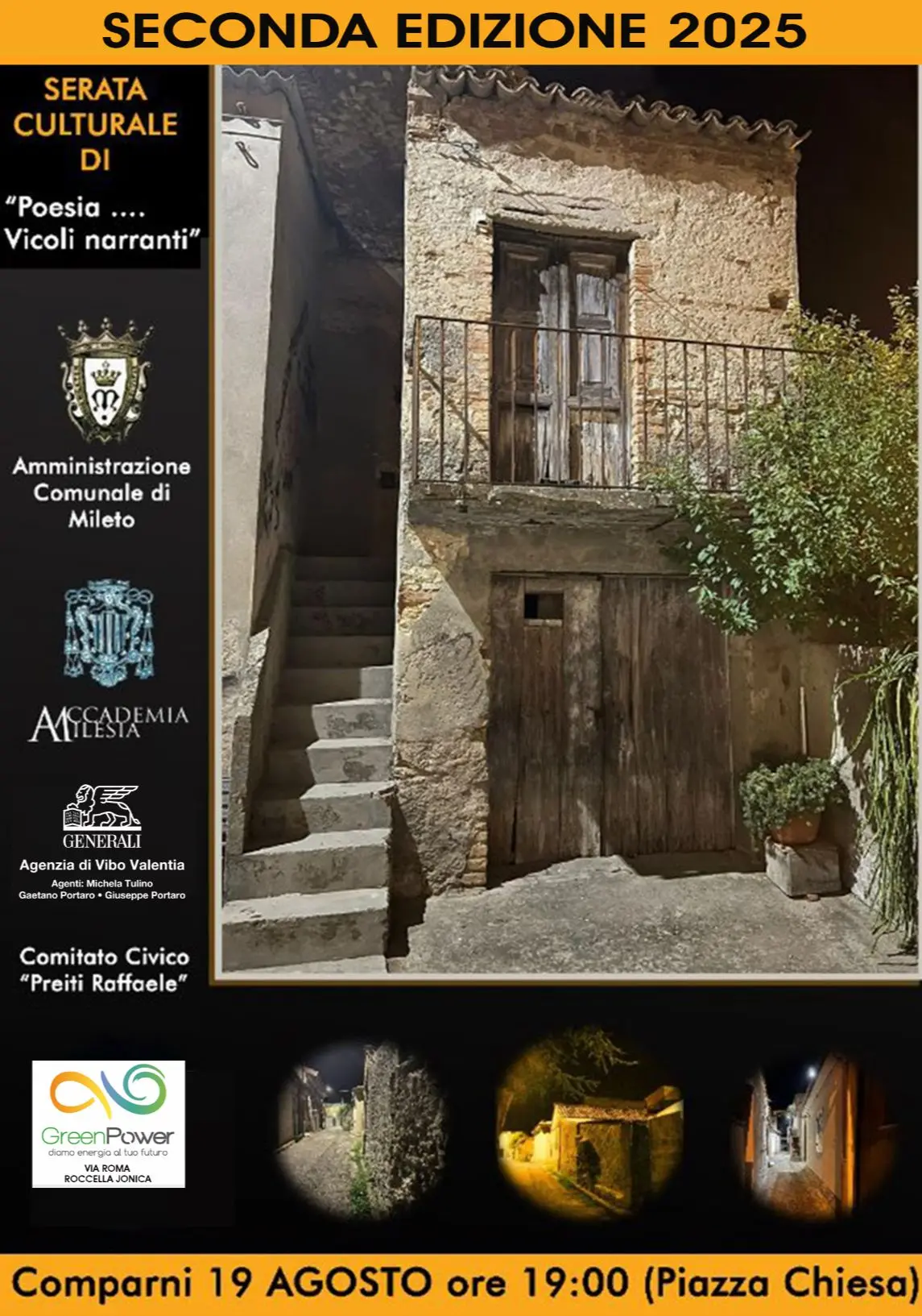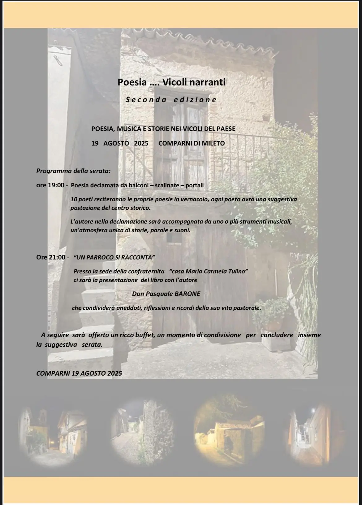 Interessante serata all’insegna della letteratura e della spiritualità a Comparni. L’appuntamento è in programma domani 19 agosto tra le vie del centro storico e all’interno della “Casa Maria Carmela Tulino”, sede della locale confraternita Maria Santissima dell’Immacolata. Si tratta, nello specifico, della rassegna “Poesia…. Vicoli narranti”, che ritorna nella frazione di Mileto dopo il successo registrato nella prima edizione del 2024. L’evento anche quest’anno è organizzato dal comitato civico, intitolato alla memoria del valente insegnante e poeta del luogo Raffaele Preiti, e dall’associazione culturale Accademia Milesia, con il patrocinio dell’amministrazione comunale e il supporto dell’Agenzia Generali di Vibo Valentia e Green Power Energia Srl di Roccella Jonica. In questo 2025 saranno undici i poeti calabresi che declameranno i loro componimenti in vernacolo da balconi, scalinate e portali del borgo, accompagnati con arpa, violino e chitarra.