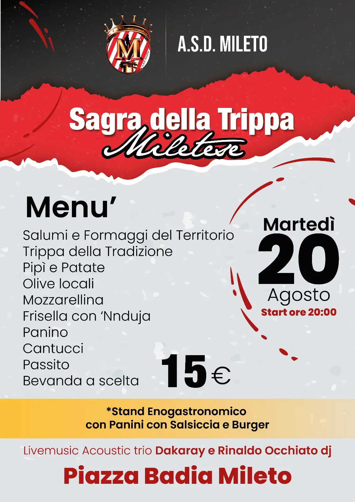 Ritorna a Mileto il tradizionale appuntamento con la Sagra della Trippa. Per alcuni anni l’evento culinario è stato tra i più attesi del calendario estivo vibonese, riuscendo a calamitare nella cittadina normanna centinaia di persone, desiderose di assaggiare nei molteplici gusti questa tipologia di piatto. Sospeso da oltre un decennio, riprende vita nel 2024 per volontà della neonata Asd Mileto, società di calcio iscritta al regolare campionato di Terza Categoria. Un ritorno nel pieno rispetto della storia e del vissuto del territorio, visto che la cittadina normanna vanta la presenza di rinomati maestri “gucceri”, tramandatisi il mestiere da padre in figlio. Mileto, tra l’altro, tutt’oggi è conosciuta in Calabria anche con l’appellativo di “città delle carni”, caratteristica confermata pure dal fatto che, attualmente, sul suo territorio operano due mattatoi specializzati nell’allevamento e nella macellazione degli animali. La Sagra della Trippa miletese è in programma domani 20 agosto in piazza Badia, a partire dalle ore 20. Il vassoio proposto dagli organizzatori conterrà al suo interno: salumi e formaggi del territorio, trippa della tradizione, pipi e patati, olive locali, mozzarelline, frisella con ‘nduia, panino, cantucci, passito e bevanda a scelta. Il costo è di 15 euro. Nel corso della serata sarà attivo uno stand enogastronomico con panini farciti di salsiccia e burgher. L’edizione 2024 della Sagra della Trippa miletese sarà allietata da Livemusic acoustic trio Dakaray e da Rinaldo Occhiato dj.