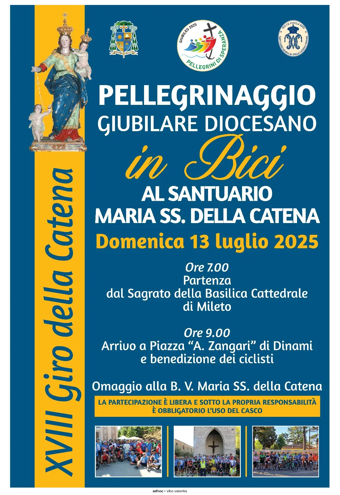 Tutto pronto per la XVIII edizione del “Giro della Catena”, promossa annualmente dal gruppo ciclistico “KataClub Mileto” in occasione della tradizionale festa di Maria Santissima della Catena, in programma domani 13 luglio a Dinami. La lodevole iniziativa di sport e fede cristiana si arricchisce in questo 2025 di ulteriori significati, essendo stata inserita dalla diocesi di Mileto-Nicotera-Tropea tra i pellegrinaggi territoriali, rientranti nell’ambito del Giubileo universale della Speranza aperto nel 2024 da Papa Bergoglio. Questo evento rappresenta per i partecipanti un vero e proprio atto d’amore e di devozione nei confronti della Vergine Maria, pronti anche in questa XVIII edizione a raggiungere in bicicletta il noto santuario vibonese, provenienti da tutta la Calabria, dopo essersi cimentati lungo un tracciato di oltre 30 chilometri, fatto di continui sali scendi che, sicuramente, ne metteranno a dura prova il loro fisico. Nella giornata di domani la partenza dei bici-pellegrini è prevista alle 7, dal sagrato della basilica cattedrale, chiesa madre della diocesi miletese. L’arrivo e l’accoglienza dei corridori in piazza “A. Zangari”, al santuario mariano della Madonna della Catena di Dinami, è invece in programma alle 9.30. Qui, dopo il suggestivo rito della deposizione di un omaggio floreale ai piedi dell’effigie della Vergine Maria, ci sarà la recita della “Preghiera del Ciclista”. Subito dopo i partecipanti riceveranno la benedizione solenne, da parte del parroco don Rocco Suppa, e parteciperanno a un sano momento conviviale offerto dalla comunità di Dinami. Seguirà la ripartenza, con destinazione finale la stessa Mileto.