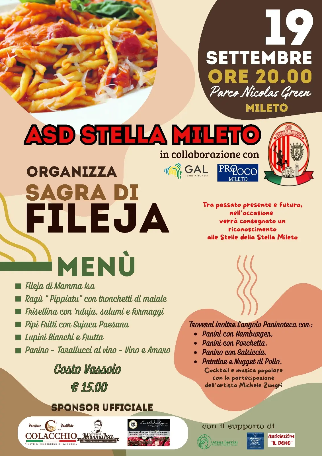 Mileto si appresta ad accogliere l'ultimo evento culinario della stagione estiva 2025. Si tratta, in questo caso, della Sagra dei Fileja, in programma domani 19 settembre nel parco Nicholas Green , a partire dalle 20. Nell'area verde attrezzata, da poco ridata in gestione dal Comune, la rassegna culinaria viene organizzata dalla società sportiva Stella Mileto , squadra di calcio attualmente militante nel campionato di Prima Categoria. Il sodalizio si avvarrà, nell'occasione, della collaborazione del Gal Terre Vibonesi e della locale associazione turistica Pro Loco e del supporto della Cooperativa sociale Atena servizi, di Accademia Empoli Mileto e dell'associazione Il Dono. Il ricco menù proposto dagli organizzatori prevede, nello specifico, fileja di Mamma Isa, ragù “pippiatu” con tronchetti di maiale, frisellina con mix di 'nduja, salumi e formaggi , pipi fritti con suriaca paesana, lupini bianchi, frutta, tarallucci, vino e amaro. Il costo del singolo vassoio sarà di 15 euro.