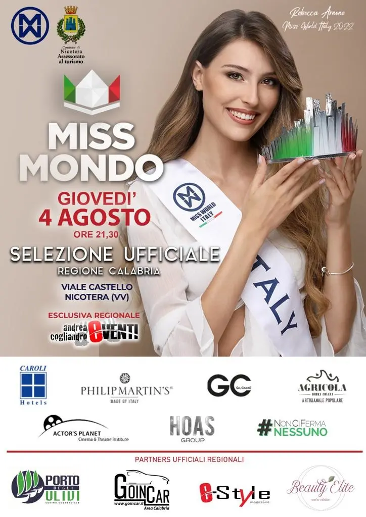 Sarà la città di Nicotera ad ospitare la selezione ufficiale per la regione Calabria del concorso di bellezza “Miss Mondo”. L’appuntamento è per giovedì 4 agosto, alle ore 21:30, lungo il viale dietro al Castello Ruffo. Una splendida cornice, con un affaccio sul mare che spazia dal porto di Gioia Tauro allo Stretto di Messina e fino alle isole Eolie.