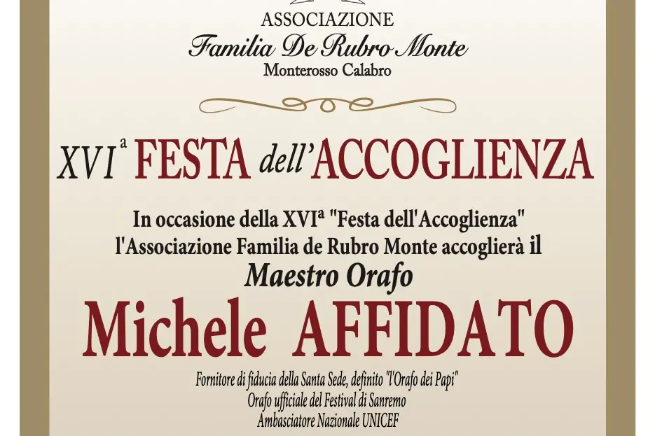 È tutto pronto per la XVI edizione della Festa dell’accoglienza, in programma oggi, sabato 22 novembre, alle ore 17:30 nella Sala consiliare di Monterosso Calabro. L’iniziativa, promossa dall’Associazione Familia De Rubro Monte, si conferma un appuntamento centrale per la comunità, coniugando cultura, valori sociali e tradizione. A rendere particolarmente significativa l’edizione di quest’anno sarà la presenza del maestro orafo Michele Affidato, figura di spicco nel panorama internazionale dell’arte orafa. Fornitore della Santa Sede, orafo ufficiale del Festival di Sanremo e Ambasciatore nazionale Unicef, Affidato è da tempo conosciuto come “l’orafo dei Papi” per la sua lunga esperienza nel campo dell’arte sacra e dell’alta gioielleria.
