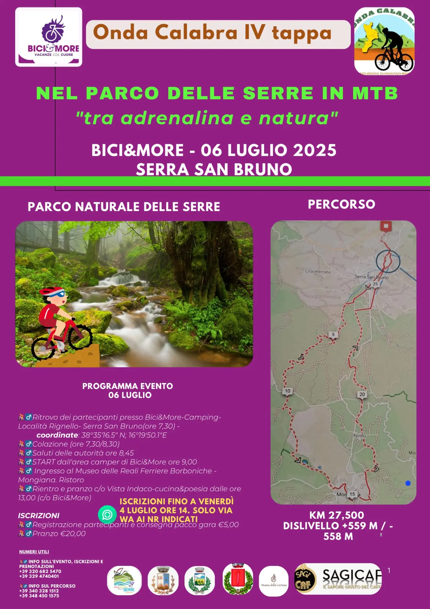 I partecipanti si cimenteranno lungo un percorso di circa 27 chilometri che, tra l’altro, permetterà loro di trascorrere una sana giornata di aggregazione sociale all’insegna del pedale e di toccare con mano la bellezza del Parco naturale delle Serre. Tra i punti toccati, il sentiero Frassati, la Certosa e la chiesa di Santa Maria del Bosco. Il ritrovo dei cicloamatori è previsto alle 7.30 presso il Bici&More-Camping di località Rignello. Dopo la colazione e il saluto delle autorità del territorio, alle 9 ci sarà la partenza del gruppo, pronto ad inoltrarsi tra la natura incontaminata del luogo. Tra i momenti clou, l’ingresso al museo delle Reali Ferrerie Borboniche di Mongiana e la possibilità di ammirare i preziosi cimeli di una realtà industriale tra le più importanti d’Europa, purtroppo chiusa nell’ottocento, all’indomani del processo unitario dell’Italia.