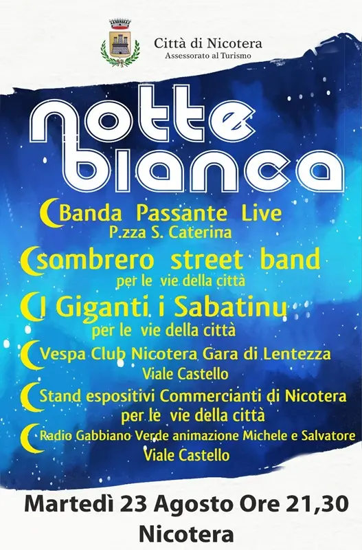 Tutto pronto a Nicotera per la Notte bianca. L’iniziativa, organizzata dall’amministrazione comunale e in particolare dall’assessorato al Turismo, torna nella cittadina costiera dopo qualche anno di stop. L’appuntamento è per martedì 23 agosto, a partire dalle ore 21:30. Ricco il programma che prevede musica, intrattenimento ed esposizioni commerciali. In piazza Santa Caterina si esibirà la Banda passante live, mentre per le vie del paese si esibiranno i “Giganti i Sabatinu” e la Sombrero street band. Lungo il viale dietro il castello Ruffo sarà possibile ammirare la gara di lentezza del Vespa club di Nicotera. Per tutta la serata inoltre nelle varie vie del centro ci saranno gli stand espositivi dei commercianti del posto. Sarà presente, ad animare la serata, anche Radio Gabbiano verde.