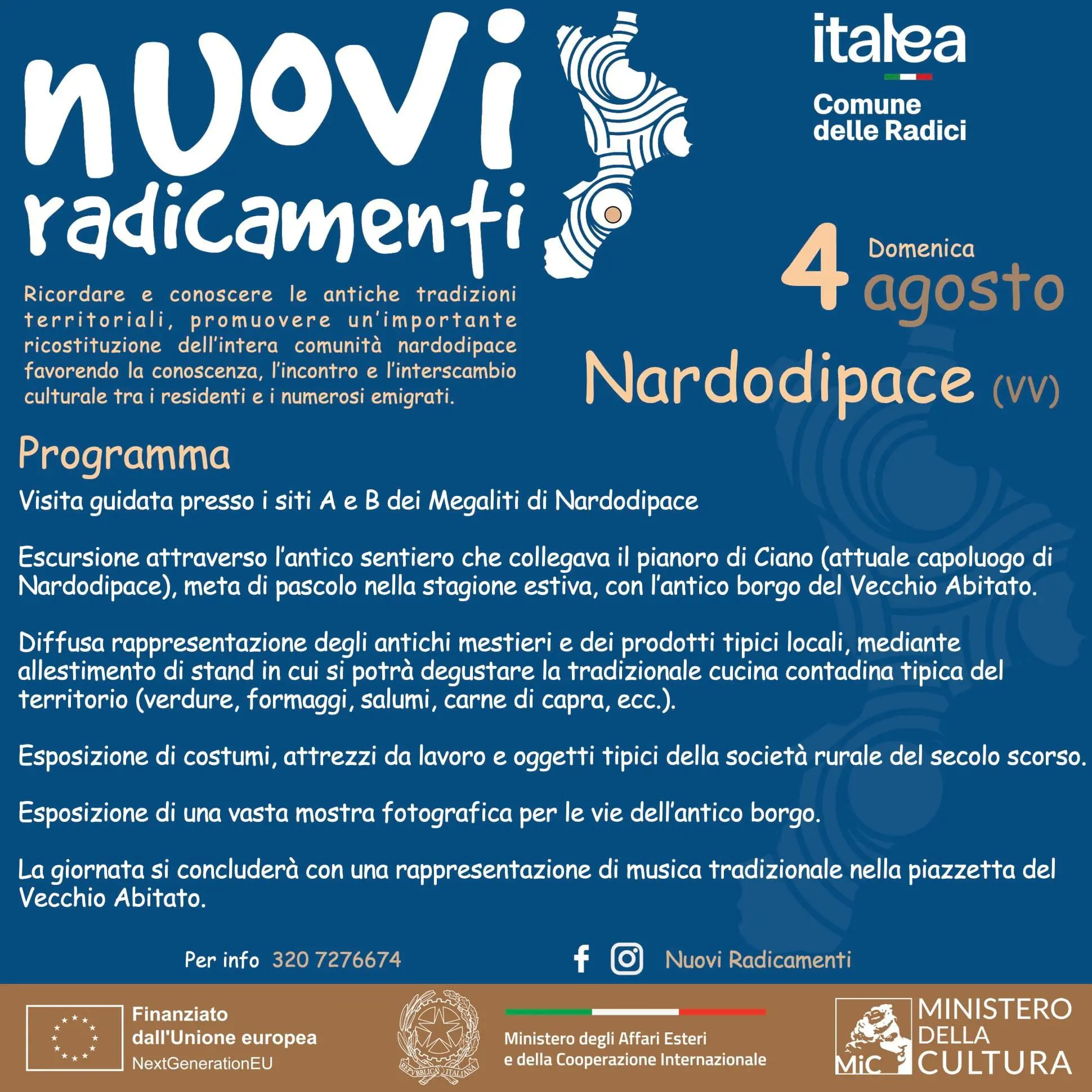 Prosegue il percorso di Nuovi radicamenti. Il progetto, domenica 4 agosto, farà tappa a Nardodipace. Un’importante occasione per riscoprire e valorizzare le antiche tradizioni territoriali, promuovendo una ricostituzione dell’intera comunità montana e favorendo la conoscenza e l’interscambio culturale tra residenti ed emigrati. Questo il programma della giornata, che avrà inizio alle 14:00 con la visita ai megaliti: