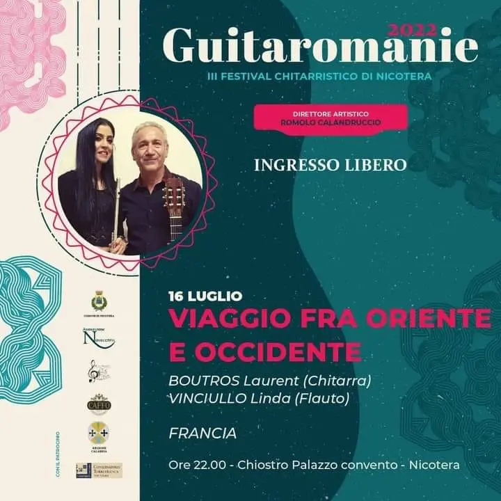 Continuano gli appuntamenti culturali a Nicotera, che sta per entrare nel vivo della stagione estiva. Parte infatti il “Guitaromanie 2022”, III festival chitarristico del paese, il cui direttore artistico è Romolo Calandruccio. L’evento si terrà all’interno del chiostro di Palazzo Convento a Nicotera sabato 16 luglio alle ore 22:00. Protagonisti saranno i due artisti francesi Boutros Laurent alla chitarra e Vinciullo Linda al flauto che terranno un concerto denominato “Viaggio fra oriente ed occidente”. Certamente un modo per attraversare diverse culture tramite la musica. Ingresso libero.