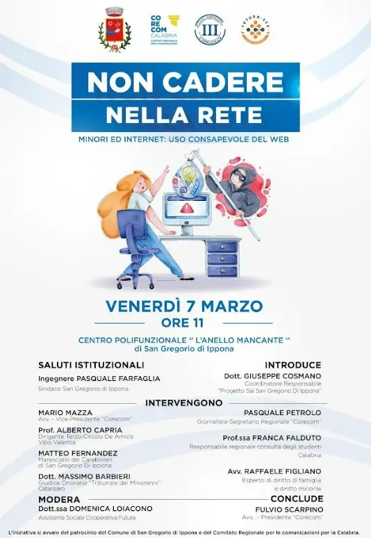 “Non cadere nella rete. Minori e internet: uso consapevole del web”. È questo il titolo dell’iniziativa in programma il 7 marzo alle ore 11 al Centro polifunzionale L’Anello mancante di San Gregorio d’Ippona. L’iniziativa viene promossa dalla Cooperativa Futura in collaborazione con il Comune di San Gregorio d’Ippona.
