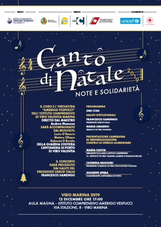 In occasione delle festività natalizie ormai alle porte, Vibo Marina si illumina di luci ideali: e lo fa con un grande concerto di sensibilizzazione, organizzato dall’Istituto comprensivo Amerigo Vespucci diretto da Maria Salvia in collaborazione con il Gruppo Pubbliemme – network LaC. I partner d’eccezione, in questa giornata che si annuncia tra le più attese del calendario festivo vibonese, saranno: Unicef – Fondo delle Nazioni Unite per l’infanzia, Capitaneria di Porto – Guardia Costiera, Croce Rossa Italiana, Comune di Vibo Valentia. Grande soddisfazione è stata espressa dagli organizzatori per la presenza del presidente italiano Unicef Francesco Samengo, che avrà il compito di aprire l’evento previsto in data 12 dicembre, alle ore 17.00, nell’aula magna dell’istituto di via Stazione.