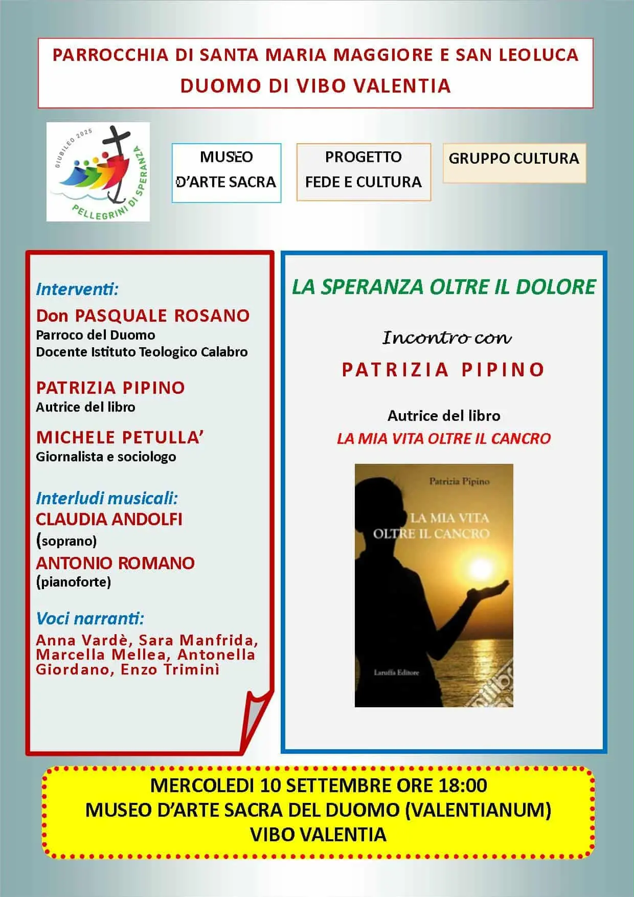 Questa sera alle ore 18 al Museo d’arte sacra del Duomo di Vibo Valentia, si terrà l’incontro dal titolo “La Speranza oltre il dolore”. Protagonista della serata sarà Patrizia Pipino, poetessa e scrittrice di Palmi, autrice del libro “La mia vita oltre il cancro”, che offrirà ai presenti la propria testimonianza di vita. A dialogare con lei saranno don Pasquale Rosano, parroco del Duomo e docente presso l’Istituto teologico calabro, e Michele Petullà, giornalista e poeta vibonese, che condurrà e coordinerà l’incontro.