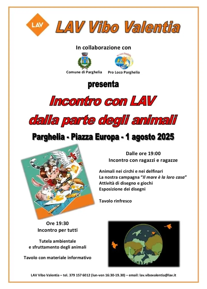 La Lega Antivivisezione (Lav) di Vibo Valentia si prepara a un nuovo, significativo appuntamento a Parghelia, reiterando il suo impegno nella promozione di una cultura di rispetto e salvaguardia per il mondo animale. L’iniziativa, intitolata “Incontro con LAV – dalla parte degli animali”, si terrà venerdì 1 agosto, a partire dalle ore 19, nella centrale piazza Europa. L’evento è il frutto di una proficua collaborazione con la Pro Loco e l’Amministrazione comunale di Parghelia, che ancora una volta confermano il loro sostegno a queste importanti tematiche. Il programma dell’incontro è stato studiato per coinvolgere diverse fasce d’età, con un’attenzione particolare ai più giovani. A partire dalle ore 19, i volontari della Lav daranno il via a una prima fase dedicata ai ragazzi. Saranno approfondite le spesso inaccettabili condizioni a cui sono sottoposti gli animali nei circhi e si discuterà della realtà dei “delfinari”, luoghi dove, in diversi casi, i delfini sono costretti a sostenere addestramenti sfiancanti e a vivere in vasche minuscole, subendo abusi e maltrattamenti.