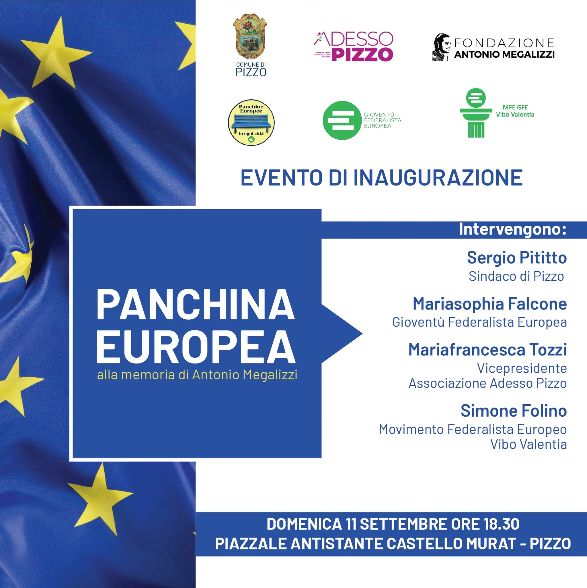 Domenica 11 settembre alle 18.30, nel piazzale antistante il castello Murat di Pizzo, sarà inaugurata la panchina con i colori della bandiera europea. L’evento è stato organizzato dall’associazione di promozione sociale “Adesso Pizzo”, con il patrocinio del Comune e della Fondazione Megalizzi. Il direttivo dell’associazione spiega: «Un gesto per avvicinare il nostro territorio all’Europa e ai suoi valori attraverso il ricordo di Antonio Megalizzi, ventinovenne giornalista e speaker di Europhonica, assassinato durante l’attentato di Strasburgo dell’11 dicembre 2018».