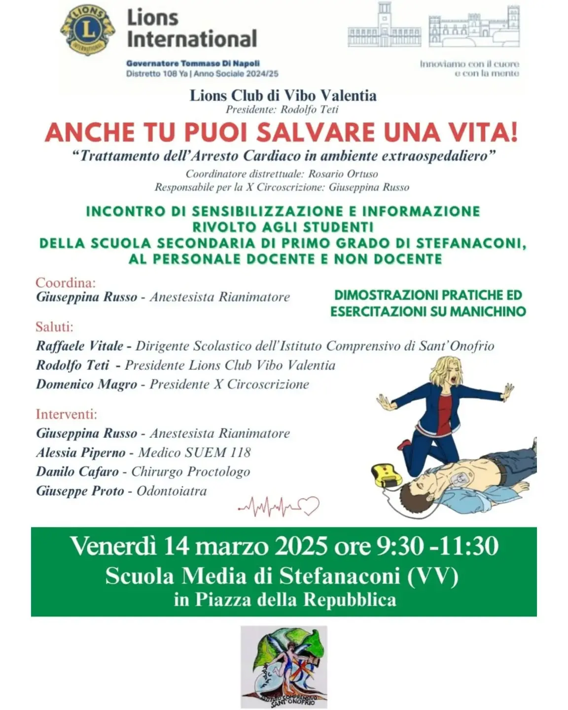 Il Lions Club di Vibo Valentia, coordinato a livello distrettuale da Rosario Ortuso, venerdì 14 marzo organizza dalle ore 9:30 alla scuola media di Stefanaconi, in piazza della Repubblica, un incontro di sensibilizzazione e informazione sul “Trattamento dell’arresto cardiaco in ambiente extraospedaliero”. Un evento aperto a studenti, personale docente e non docente. L’obiettivo è chiaro: «Fornire gli strumenti necessari per riconoscere un arresto cardiaco – hanno fatto sapere dal Lions – e intervenire tempestivamente, aumentando così le possibilità di sopravvivenza». “Anche tu puoi salvare una vita” è il motto che campeggia sul materiale informativo, un invito a non restare inerti di fronte a un’emergenza.