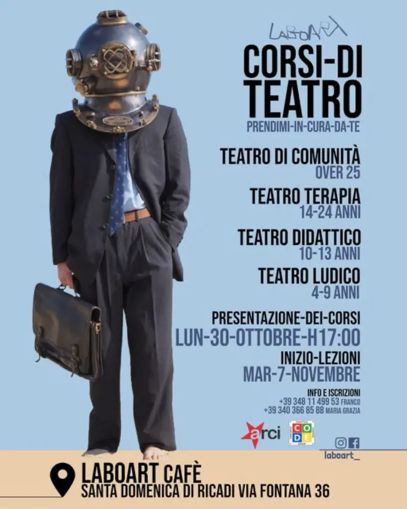 Tra pochi giorni riaprono le porte di LaboArt per la presentazione di tutte le iniziative teatrali che andranno a comporre l’offerta formativa 2023-2024. L’illustrazione dei corsi, avrà luogo lunedì 30 ottobre alle ore 17:00 presso la sede di LaboArt Cafè, a Santa Domenica di Ricadi, mentre, una volta concluse le iscrizioni, le lezioni prenderanno inizio da martedì 7 novembre. Quattro i percorsi formativi ideati per i ragazzi tra i 4 ed i 25 anni, messi a disposizione per quest’anno dagli organizzatori: “Teatro di comunità”, dedicato agli over 25; “Teatro terapia”, per ragazzi di età compresa fra i 14 e i 24 anni; “Teatro didattico”, riservato a ragazzi dai 10 ai 13 anni; ed in fine “Teatro ludico”, previsto per i bambini dai 4 ai 9 anni che potranno sperimentare l’approccio con diverse forme espressive.