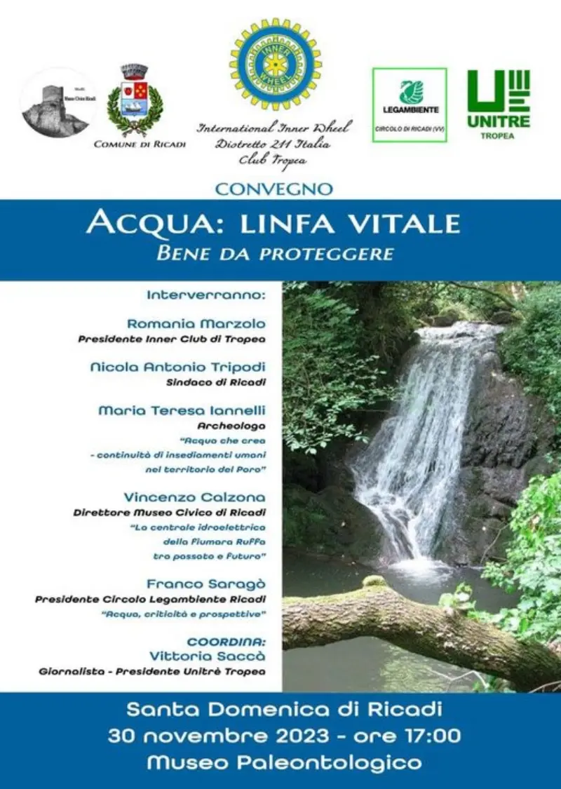 Tutto pronto per giovedì 30 novembre alle ore 17:00, al museo paleontologico “MuRi” di Santa Domenica di Ricadi dove si svolgerà il convegno dal titolo “Acqua: linfa vitale, bene da proteggere”. Un appuntamento organizzato dal direttore del museo civico “MuRi” di Ricadi Vincenzo Calzona, in collaborazione con l’amministrazione comunale, l’International Inner Wheel – Distretto 211 Italia Club Tropea, il circolo Legambiente di Ricadi e dall’Unitre di Tropea. All’incontro, cui prenderanno parte anche la presidente Inner Club di Tropea Romania Marzolo e il sindaco di Ricadi Nicola Antonio Tripodi, si parlerà di “Acqua che crea – continuità di insediamenti umani nel territorio del Poro” con l’archeologa Maria Teresa Iannelli. Altro elemento centrale del dibattito sarà “La centrale idroelettrica della fiumara Ruffa, tra passato e futuro”, a cura dell’architetto Vincenzo Calzona. Infine, il dibattito si chiuderà sul tema “Acqua, criticità e prospettive”, affrontato dal presidente del circolo Legambiente di Ricadi Franco Saragò.