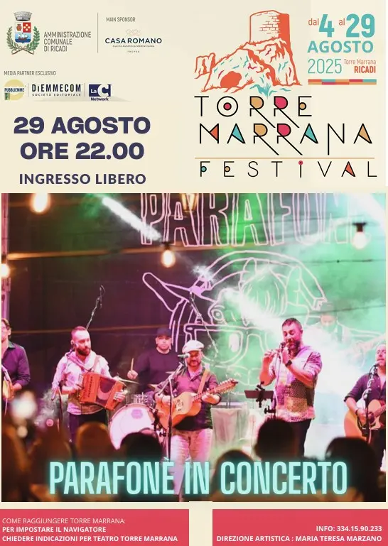 Il Torre Marrana Festival, si avvale della collaborazione di Maria Teresa Marzano che si è occupata della direzione artistica, del media partner esclusivo Publiemme – DiEmmecom Società Editoriale – LaC Network che ha curato l’immagine e la comunicazione, del main sponsor Casa Romano Cucina Autentica Mediterranea di Mario Romano e della presenza dei i volontari dell’Associazione Croce Azzurra Tropea e Ricadi.