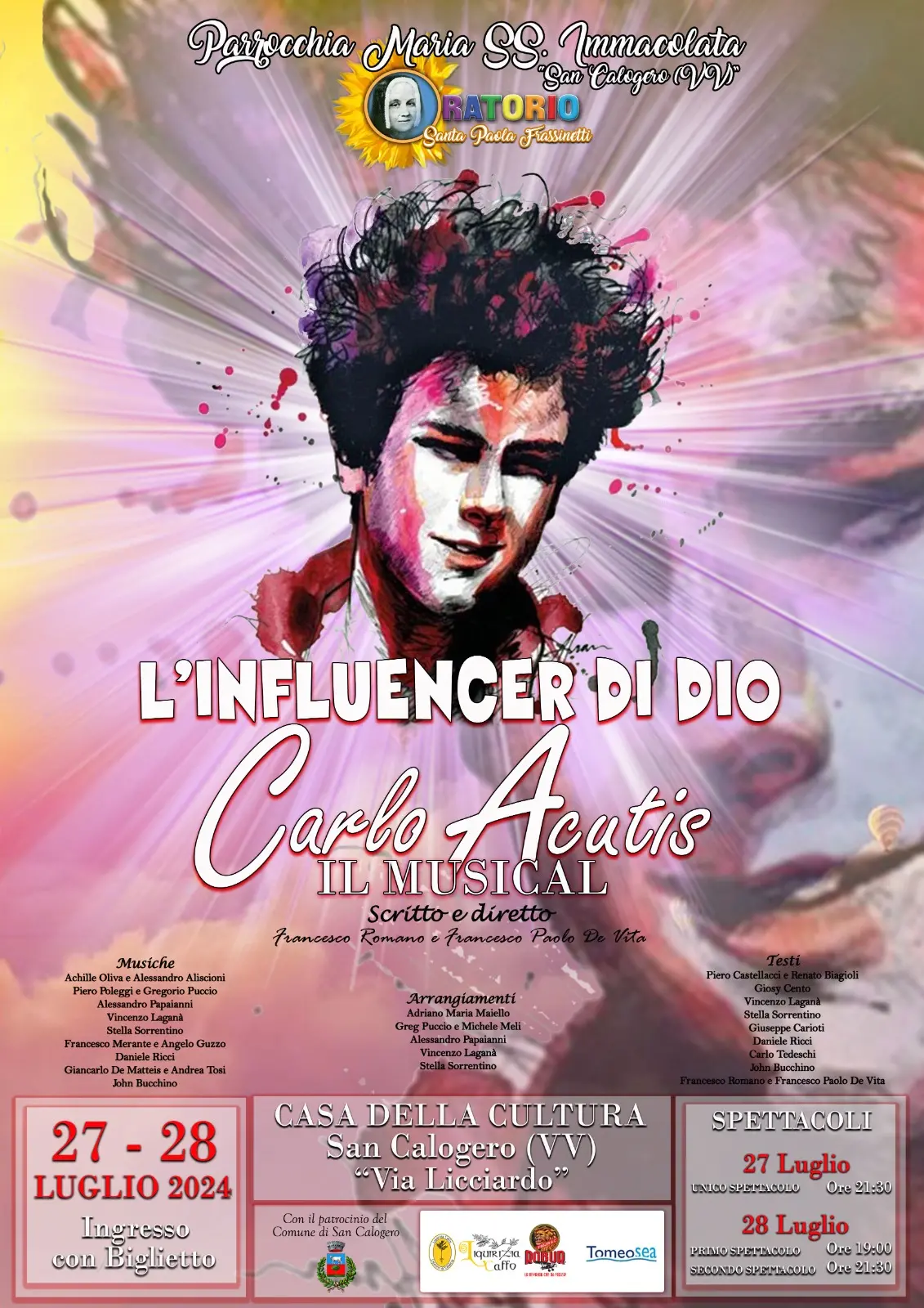 San Calogero si prepara ad ospitare la prima nazionale del musical “L’Influencer di Dio”, dedicato alla figura del Beato Carlo Acutis. Lo spettacolo, scritto e diretto da Francesco Romano e Francesco De Vita, con un cast di 25 elementi, si terrà sabato 27 luglio alle ore 21:00 e domenica 28 luglio alle ore 19:00 e alle ore 21:30 nei nuovi locali della Casa della cultura in via Licciardo. Un lavoro corale inedito: “L’Influencer di Dio” è un’opera originale, con musiche e testi inediti creati dai due registi. La realizzazione dello spettacolo ha richiesto un impegno imponente da parte di tutto il cast e della produzione, che hanno lavorato con passione per portare in scena la storia di questo giovane straordinario.