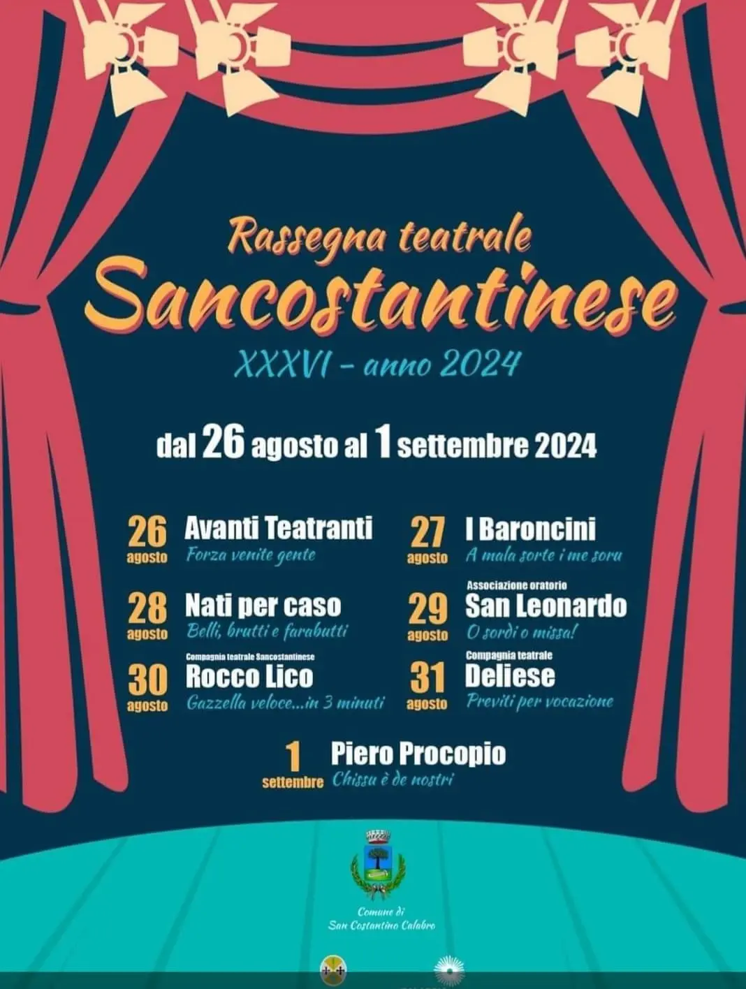 Il calendario predisposto dall’amministrazione comunale guidata dal sindaco Nicola Derito prevede, a seguire, domani 27 agosto lo spettacolo “A mala sorti i me soru” della compagnia “I Baroncini” di Rizziconi, mercoledì 28 la commedia brillante “Belli bravi e farabutti” della compagnia “Nati per caso”, il 29 lo spettacolo “O sordi o missa” proposto dall’associazione Oratorio San Leonardo di Longobardi. Venerdì 30 e sabato 31 si esibiranno, rispettivamente, la compagnia teatrale Sancostantinese “Rocco Lico”, interprete della commedia brillante “Gazzella veloce… in tre minuti”, e la compagnia teatrale Deliese di Delianova con l’opera “Previti per vocazione”. L’edizione 2024 della rassegna teatrale si concluderà domenica 1 settembre con lo spettacolo di Piero Procopio, dal titolo “Chissu è de nostri”. Anche quest’anno le varie compagnie si esibiranno davanti a un pubblico numeroso e attento. Del resto, la Rassegna teatrale sancostantinese è una delle manifestazioni estive più attese nella provincia di Vibo Valentia. Il fine degli organizzatori, come sempre, è quello di promuovere e valorizzare l’arte del teatro nelle sue molteplici sfaccettature, su un territorio che in questo settore vanta una lunga tradizione.
