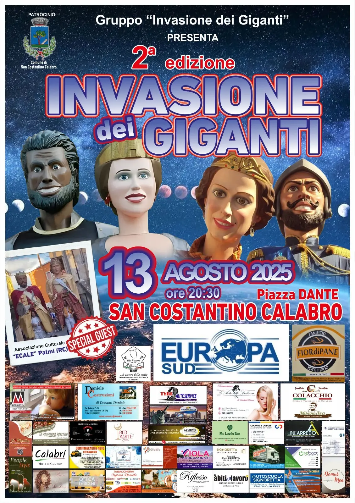 Dopo il successo della scorsa edizione i “giganti” approdano di nuovo a San Costantino Calabro. Nel paese alle porte di Vibo Valentia è prevista per questa sera 13 agosto l’“invasione” dei mitici colossi in cartapesta raffiguranti Mata e Grifone e le rispettive varianti. La rassegna prenderà il via alle 20.30 e durerà fino a notte inoltrata. Dopo il giro a passo di danza e al suono di tamburi per le vie del centro, le coppie di giganti si divideranno in gruppi per poi approdare in piazza Dante per l’esibizione singola, la tamburriata e l’amplesso finale. Anche questa seconda edizione dell’evento estivo viene organizzata dal locale gruppo “Invasione dei giganti” con il patrocinio del Comune e l’ausilio di numerosi sponsor. A San Costantino Calabro nell’occasione giungeranno oltre 20 coppie di colossi in cartapesta provenienti da tutta la Calabria. Ospiti d’eccezione, quelli dell’associazione culturale “Ecale” di Palmi, cittadina dove la tradizione dei giganti è particolarmente sentita e molto radicata.