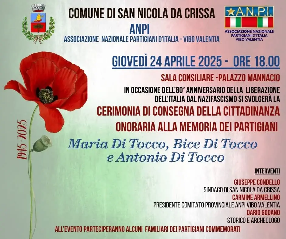 Un tributo sentito a coloro che, con coraggio e abnegazione, hanno contribuito a liberare l’Italia dall’oppressione. Giovedì 24, la comunità di San Nicola da Crissa si stringerà in un abbraccio ideale attorno alla memoria di Maria, Bice e Antonio Di Tocco, tre fratelli che durante il buio periodo della Seconda Guerra Mondiale scelsero di schierarsi dalla parte della libertà, unendosi con determinazione alla Resistenza partigiana. La manifestazione, promossa dall’Anpi in sinergia con l’amministrazione comunale guidata dal sindaco Giuseppe Condello, si terrà alle ore 18 nella Sala consiliare. Sarà un momento di riflessione e di omaggio a figure che incarnano lo spirito di un’epoca di lotta per un futuro di dignità e autonomia. La cerimonia vedrà gli interventi significativi del sindaco Condello, che porterà il saluto della comunità e sottolineerà il valore dell’esempio dei fratelli Di Tocco per le nuove generazioni. A seguire, il presidente del Comitato provinciale Anpi, Carmine Armellino, offrirà una lettura storica e politica del loro impegno, inquadrando la loro scelta nel contesto più ampio della Resistenza italiana. A completare il quadro, l’archeologo Dario Godano approfondirà il profilo umano e il contesto storico-sociale in cui maturarono le loro decisioni.