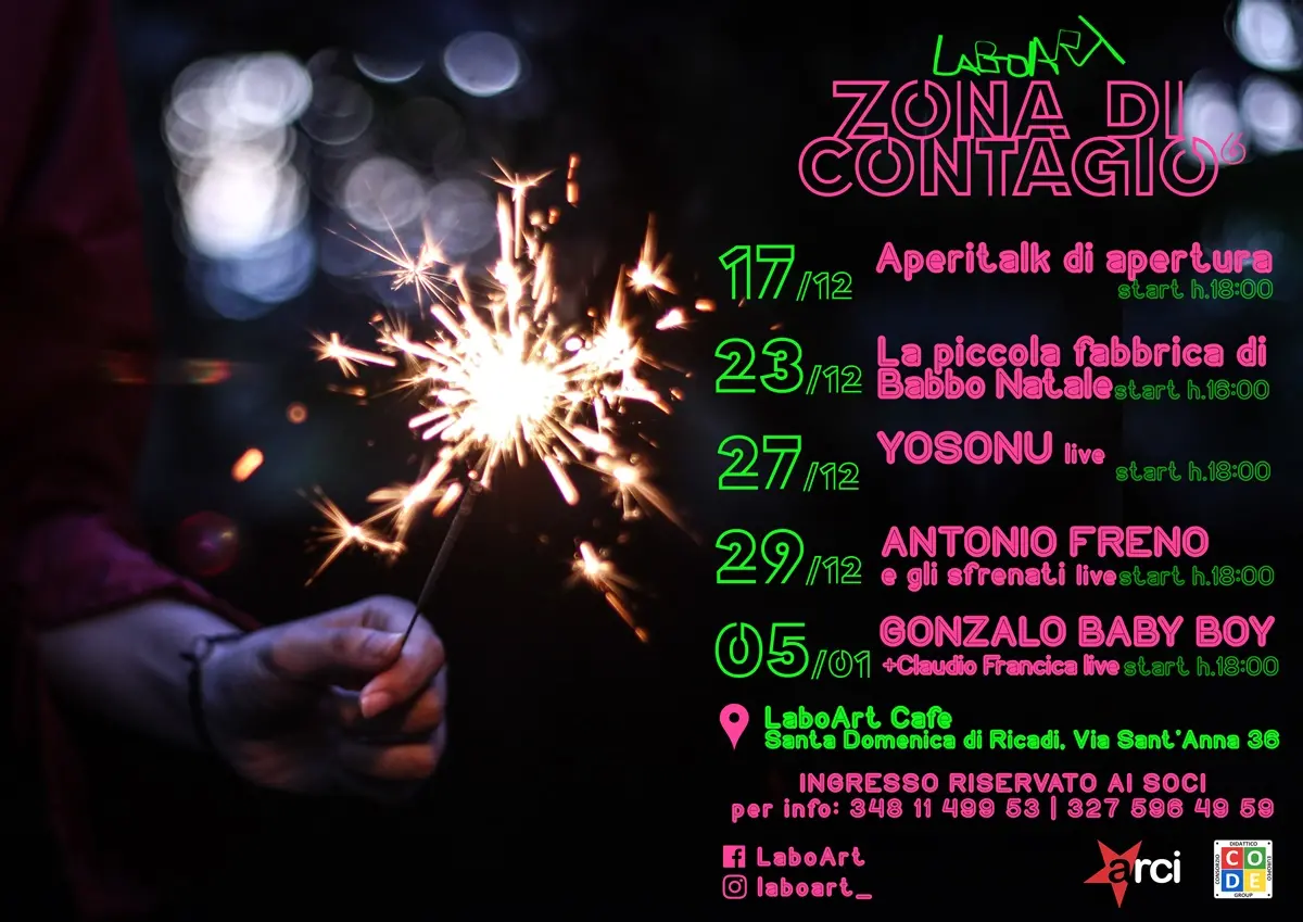 Si comincia il 17 dicembre alle 18:00 con l’AperiTalk di apertura che sarà un modo per avvicinare il pubblico alle attività di LaboArt. Si parlerà della collaborazione che LaboArt ha intrapreso con Arci e si darà il via alla campagna di tesseramento 2022/23 che sarà un pretesto per parlare della possibilità di allargare gli orizzonti dell’associazione, aprendosi alle proposte di chi abbia voglia di utilizzare LaboArt per mettere a frutto la propria proposta artistica.