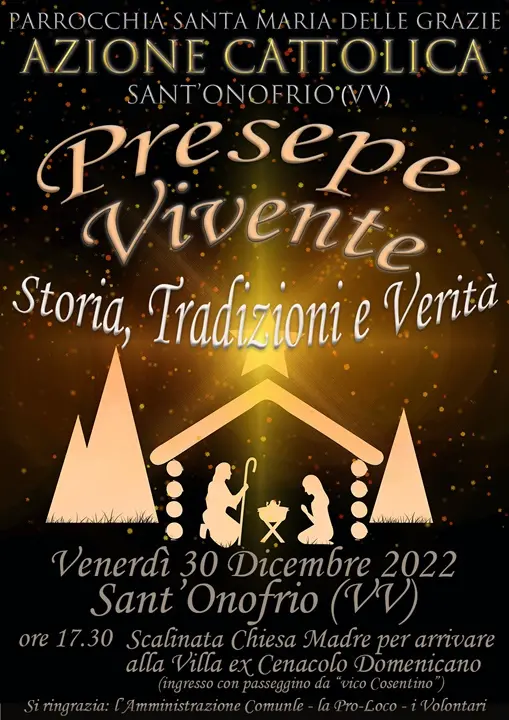 Anche a Sant’Onofrio, dopo il forzato stop a causa della pandemia, ritorna l’annuale appuntamento con il Presepe vivente. L’Azione cattolica – Parrocchia Santa Maria delle Grazie rappresenterà le tappe salienti della nascita di Gesù tra un mix di storia, tradizione e verità. Ci si ritroverà alle ore 17.30 del 30 dicembre davanti alla scalinata della Chiesa Madre: da qui ha inizio il percorso scenico, che ha il suo cuore nell’ex Cenacolo domenicano. Qui si è voluto ridare vita e lustro a luoghi chiusi da tempo, come un antichissimo “trappeto” e la storica villa sita proprio all’interno dell’ex Cenacolo. Il tutto sarà possibile anche grazie al contributo dell’amministrazione comunale, della Pro loco e di un nutrito gruppo di volontari.