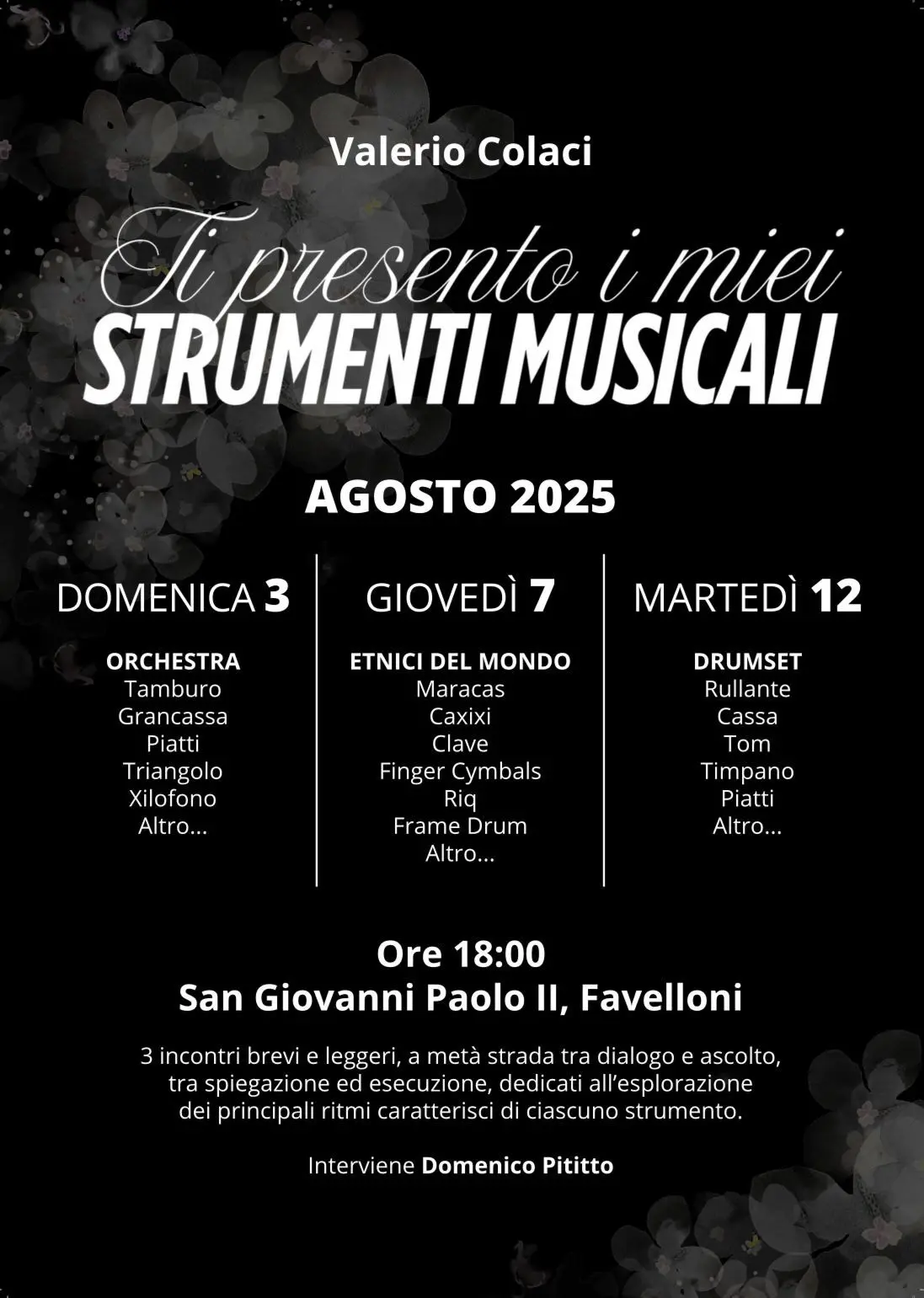 - Martedì 12 agosto: la chiusura sarà esplosiva con un approfondimento sul drumset moderno, analizzando i componenti essenziali come rullante, tom, timpano, piatti e cassa.