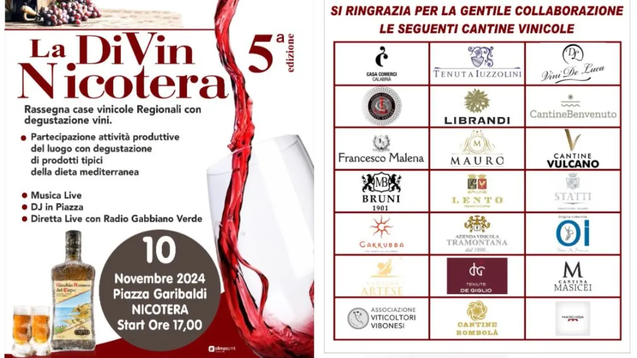 Torna la DiVin Nicotera, la rassegna di vini che ormai da qualche anno è diventata un appuntamento fisso nella cittadina costiera vibonese, sia nella sua versione estiva che in quella autunnale. Domenica 10 novembre si terrà la quinta edizione, nella cornice della centralissima piazza Garibaldi di Nicotera. Venti le cantine calabresi che saranno presenti all’evento, ad arricchire una serata in cui il vino e la convivialità saranno le protagoniste. Spazio anche alla Dieta mediterranea, che proprio in Nicotera trova una delle sue patrie, e ai prodotti tipici della tradizione. Il tutto anche grazie alle attività produttive del posto. Degustare, insomma, sarà la parola d’ordine.