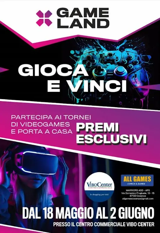 Dopo il successo di Belvedere Marittimo, il GameLand sbarca al centro commerciale Vibo Center di Vibo Valentia. In programma due settimane di tornei di videogames con la possibilità di vincere e portare a casa premi. L’iniziativa è dedicata agli appassionati dei videogiochi e della realtà virtuale con particolare attenzione rivolta verso i più piccoli. L’appuntamento si terrà dal 18 maggio al 2 giugno. Per i promotori si tratta di «una vera e propria full immersion per gli amanti di Joystick e console, quali Xbox, Nintendo e PlayStation, ma anche per gli amanti del Card Game. Non mancheranno tornei Esports e la possibilità di giocare ai maggiori titoli con la formula Open Game. Inoltre Comics e Manga faranno da contorno oltre ad videogames e accessori, Funko Pop! e Action Figure, merchandise e il meglio del Card Game». A promuovere l’iniziativa, Raffaele Pantano, già organizzatore di eventi come Ndf, e l’All games di Cosenza.