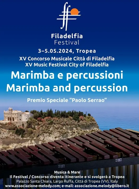 Il Festival/concorso internazionale Città di Filadelfia, organizzato dall’Associazione Melody ed intitolato al musicista e compositore Paolo Serrao è uno degli eventi musicali più importanti del Sud Italia. L’evento, giunto alla XV edizione, si svolgerà con il patrocinio dei Comuni di Tropea e Filadelfia, della Provincia di Vibo Valentia e della Regione Calabria dal 4 al 5 maggio. L’iniziativa vedrà l’adesione di percussionisti provenienti da diverse regioni italiane e soprattutto dall’estero e saranno giudicati da una giuria di alto livello il cui presidente sarà Emmanuel Séjourné compositore e percussionista francese, docente al Conservatorio di Strasburgo affiancato da Sylvie Reynaer e Ivan Mancinelli. Le audizioni continueranno dal 9 al 12 maggio con il Concorso di esecuzione musicale con le sezioni pianoforte, canto lirico, archi, fiati e musica da camera, con gruppi provenienti da Polonia, Korea, Estonia, Cina, Ucraina, U.S.A. e da diverse regioni dell’Italia. Iscrizioni aperte fino al 20 aprile.