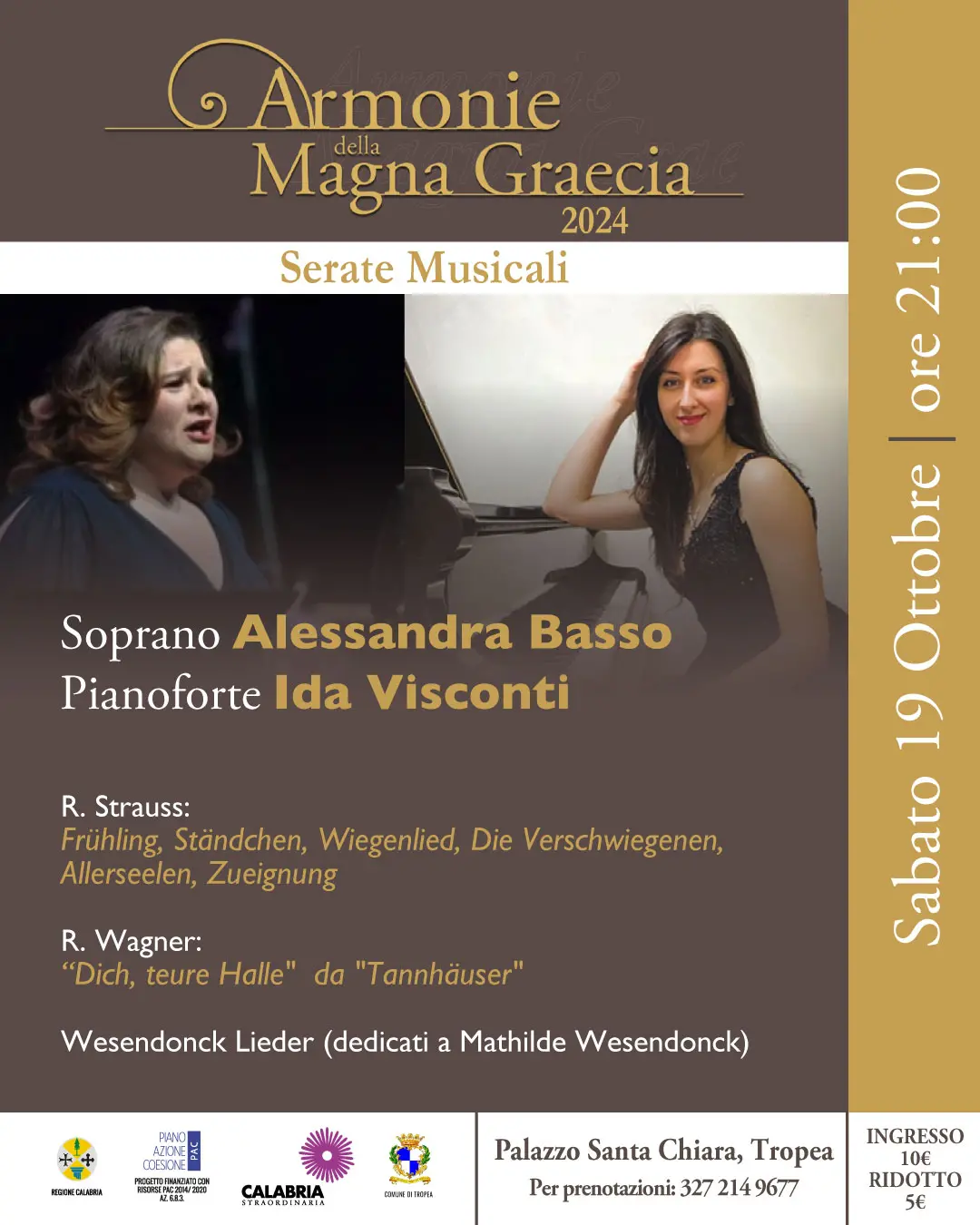 Ancora una serata musicale per il festival Armonie della Magna Graecia, diretto dal maestro Emilio Aversano, sabato 19 ottobre alle 21 all’ex monastero di Santa Chiara a Tropea, con un concerto tutto al femminile che vedrà esibirsi il soprano Alessandra Basso e la pianista Ida Visconti. L’unione di questi due talenti renderà omaggio al repertorio del tardo romanticismo tedesco, portando in scena un dialogo musicale di rara bellezza. Alessandra Basso, apprezzata per le sue interpretazioni ricche di sfumature, ha debuttato nel ruolo di Berta nelle due rappresentazioni dell’opera “Il Barbiere di Siviglia” al Teatro Giuseppe Verdi di Salerno e ha preso parte a un concerto al Teatro Kombetar i Operas dhe i Baletit di Tirana, in Albania. Ida Visconti, raffinata pianista, ha conseguito il primo premio alla Franz Schubert International Music Competition nel 2023 nella sezione Duo performance e attualmente si sta specializzando in musica da camera, con particolare attenzione al repertorio vocale liederistico.