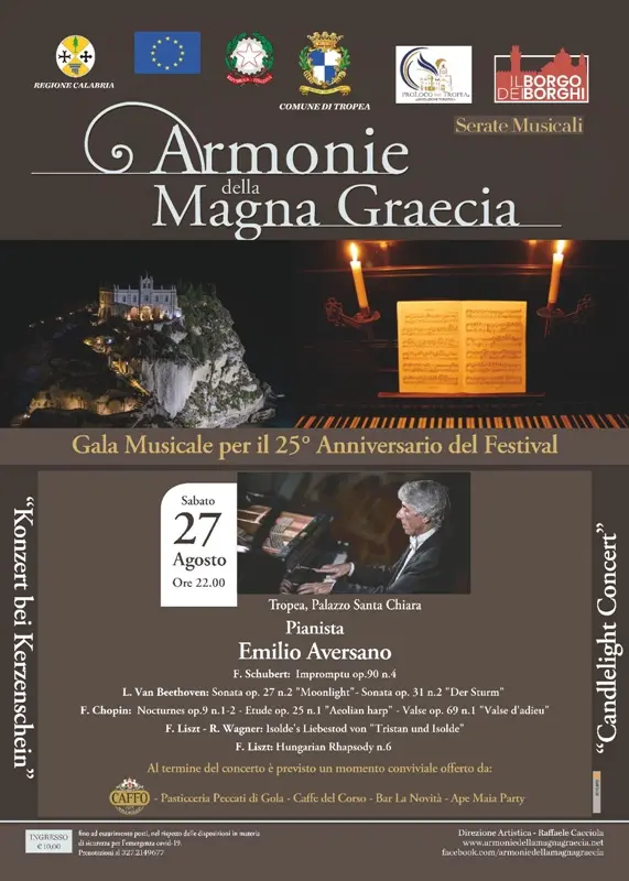 Sabato 27 agosto a Tropea, nella cornice di Palazzo Santa Chiara, alle ore 22.00 si terrà il concerto celebrativo del 25° anniversario della fondazione del Festival “Armonie della Magna Graecia”. Il concerto sarà tenuto a lume di candela dal pianista Emilio Aversano, che eseguirà alcuni tra le più celebri composizioni di musica romantica, dal Chiaro di luna di Beethoven a Chopin, fino al Tristano e Isotta di Wagner. A fine concerto sarà offerto al pubblico un momento conviviale per festeggiare insieme l’anniversario del Festival, che quest’anno prevede 25 concerti da aprile a ottobre inoltrato. [Continua in basso]