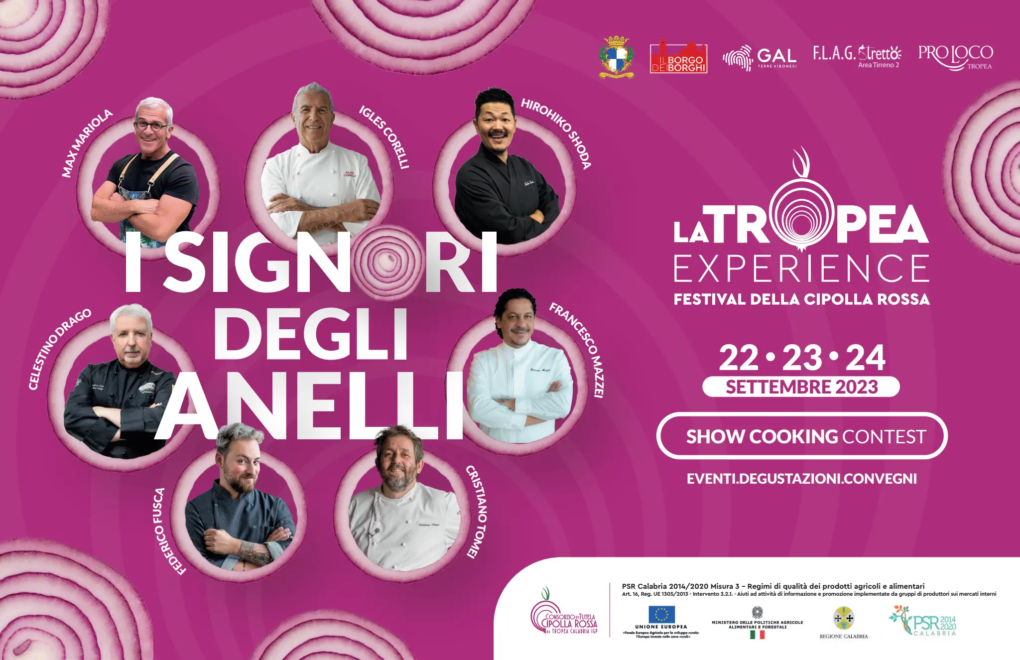 perfettamente equipaggiate i cui armatori sono soci della Delegazione della Lega Navale Italiana di Tropea nonché di altre imbarcazioni rappresentanti club velici vicini della splendida Costa degli Dei, tutte riunite per partecipare a una competizione entusiasmante che incarna il lavoro di squadra, l’abilità e lo spirito marinaresco. Si punta, inoltre, a rafforzare la competitività del territorio come destinazione turistica, attraverso il mare come risorsa, una risorsa unica nelle sue diversità. Unicità nella qualità e nella percezione che non ha eguali al mondo. “La Tropea “Food Cup ‘” si concretizza in un’attività di promozione del pescato locale, ma l’idea di fondo è quella di coordinare gli sforzi tra le istituzioni locali per definire una politica di promozione e brand unitaria ed efficace del territorio, valorizzando il patrimonio culturale, materiale e immateriale e mettendo in rete le eccellenze e le tipicità. Protagonisti dei cooking show in Piazza Cannone, affiancati dagli chef calabresi Ercole Villirillo, Luigi Quintieri, Pierluigi Vacca, Giuseppe Romano, Enzo Barbieri, Francesca Mannis l’edizione 2023 de La Tropea Experience, vedrà il ritorno di grandi chef ed ambasciatori della Cipolla Rossa nel mondo: da Igles Corelli a Max Mariola, da Hironiko Shoda a Francesco Mazzei, fino a Antonino Esposito. Con loro ci saranno quest’anno anche Cristiano Tomei, vulcanico chef dalle radici toscane, amatissimo volto televisivo e una stella Michelin e Celestino Drago, lo chef amato dalle star di Hollywood, Pioniere della moderna cucina italiana nella west coast californiana.