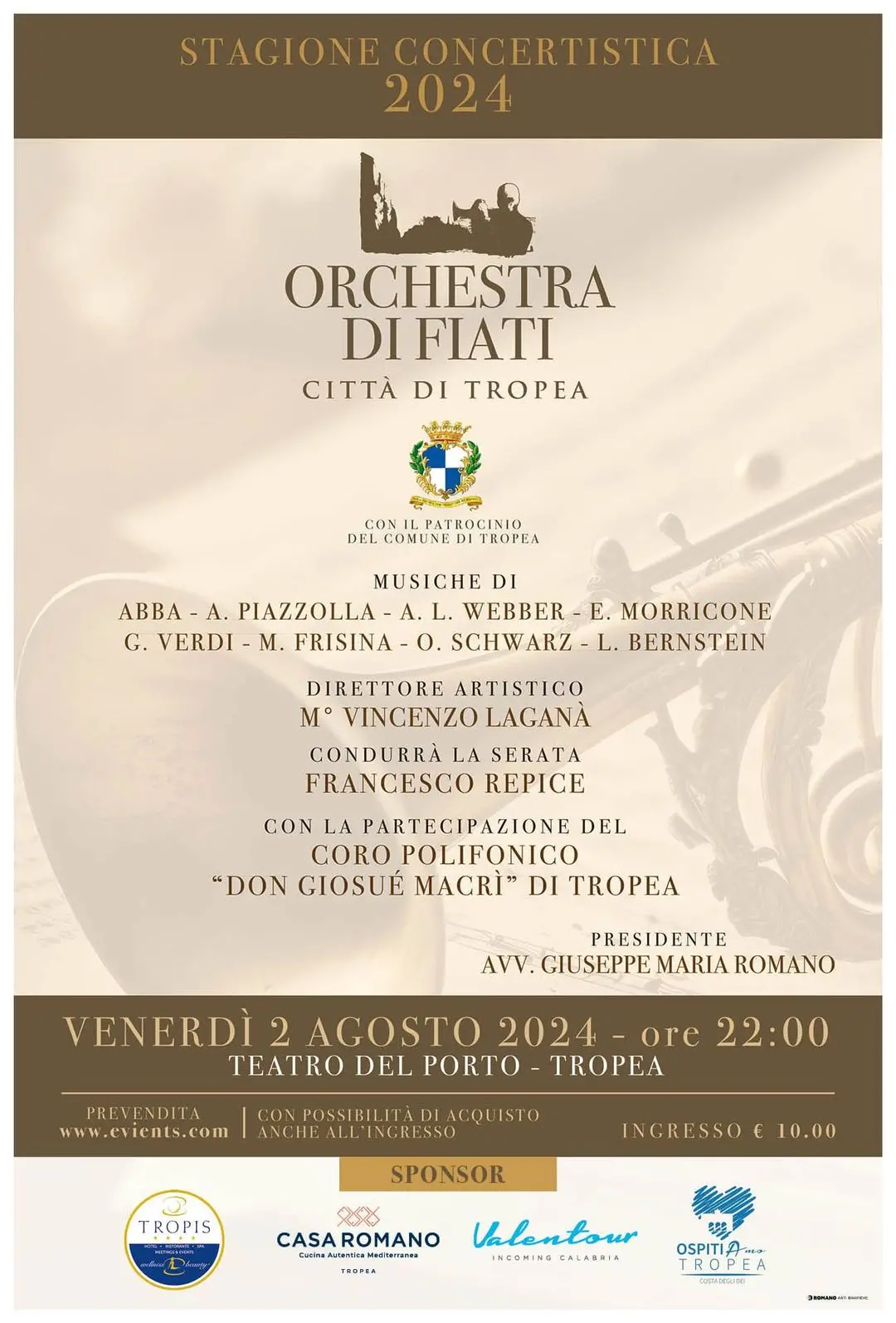 Il terzo appuntamento estivo in calendario per l’Orchestra di fiati “Città di Tropea” è per la sera di venerdì 2 agosto alle ore 22:00 all’anfiteatro del Porto. All’evento, che continua a richiamare sempre più pubblico, si unirà anche il coro “Don Giosuè Macrì” di Tropea. La serata sarà condotta dal giornalista e noto cronista sportivo Rai Francesco Repice, mentre i brani che verranno eseguiti sono tratti da un ampio repertorio: Abba, Astor Piazzolla, Andrew Lloyd Webber, Ennio Morricone, Giuseppe Verdi, Marco Frisina, Otto Martin Schwarz e Leonard Bernstein. «Sarà un concerto ricco di buona musica – ha dichiarato il maestro Vincenzo Laganà -, come si evince dalla locandina. Non mancheranno momenti di grande trasporto emotivo e momenti in cui i solisti dell’Orchestra intratterranno il pubblico presente con brani particolarmente coinvolgenti. Vi aspettiamo numerosi».