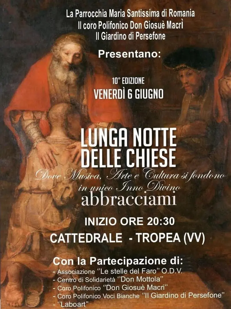 L’evento culturale e spirituale dal titolo “La lunga notte delle chiese”, giunto quest’anno alla decima edizione, è promossa e organizzata congiuntamente dalla parrocchia Maria Santissima di Romania, dal Coro polifonico “Don Giosuè Macri” e dall’associazione “Il giardino di Persefone”. Musica, arte e cultura per questo evento si fondono in un unico, sincero abbraccio, offrendo ai partecipanti un’esperienza ricca e coinvolgente all’interno di un luogo sacro. L’appuntamento è fissato per questa sera, con inizio alle ore 20:30, nella suggestiva cornice della Cattedrale di Tropea. Numerose sono le realtà del territorio che contribuiscono all’evento, garantendo una varietà di espressioni artistiche e culturali. Tra i partecipanti figurano l’associazione “Le stelle del Faro” Odv, il Centro di solidarietà “Don Mottola”, il Coro polifonico delle voci bianche e LaboArt. L’invito è rivolto a tutti coloro che desiderano trascorrere una serata all’insegna dell’arte, della musica e della riflessione, immersi nell’atmosfera unica della Cattedrale di Tropea.