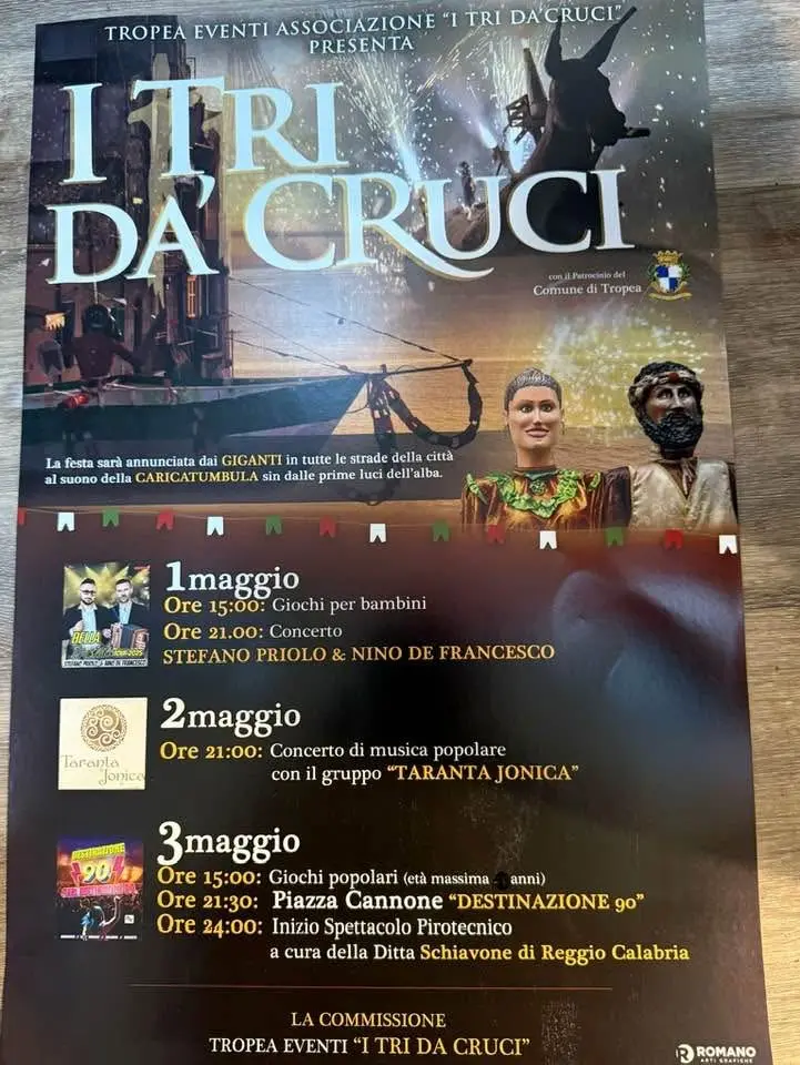 La città di Tropea si prepara a celebrare una delle sue festività più sentite e importanti, la festa storico-culturale “I Tri da Cruci”. La manifestazione, che si terrà nei giorni 1-2-3 maggio, rievoca le gesta eroiche del capitano Gaspare Toraldo e dei suoi uomini nella battaglia di Lepanto del 1571 quando sconfissero la flotta ottomana. Il Comune ha stanziato un contributo di 10.000 euro in favore dell’associazione TropeaEventi per sostenere le spese organizzative. L’Ente, inoltre, s’impegna a fornire supporto logistico, tra cui la concessione del suolo pubblico, l’autorizzazione all’affissione dei manifesti, l’installazione del palco e l’intervento della Protezione civile, della Polizia municipale, ed anche il pagamento dei diritti Siae. L’Associazione Tropeaeventi, presieduta da Nicola de Lorenzo, avrà il compito di organizzare e gestire l’evento, coordinando le attività e utilizzando le risorse messe a disposizione dal Comune. Ecco il programma:
