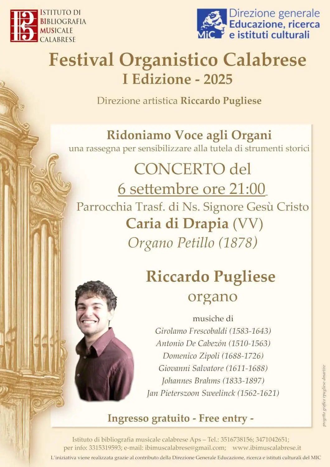 Un appuntamento musicale di grande rilevanza si terrà questa sera a Caria di Drapia con la prima edizione del Festival organistico calabrese. La manifestazione promossa dall’Istituto di bibliografia musicale calabrese e dal Mic – direzione generale Educazione, ricerca e istituti culturali, con la direzione artistica di Riccardo Pugliese, ha l’obiettivo di ridare voce agli organi e di sensibilizzare alla tutela di strumenti storici. Il concerto si svolgerà alle ore 21 nella parrocchia della Trasfigurazione di Nostro Signore Gesù Cristo a Caria. Protagonista della serata sarà un organo Petillo del 1878. Sullo storico strumento si esibirà il maestro Riccardo Pugliese, che guiderà il pubblico attraverso un repertorio di compositori che spazia dal Cinquecento all’Ottocento. Il programma prevede musiche di Girolamo Frescobaldi, Antonio De Cabezón, Domenico Zipoli, Giovanni Salvatore, Johannes Brahms e Jan Pieterszoon Sweelinck. L’ingresso è gratuito.