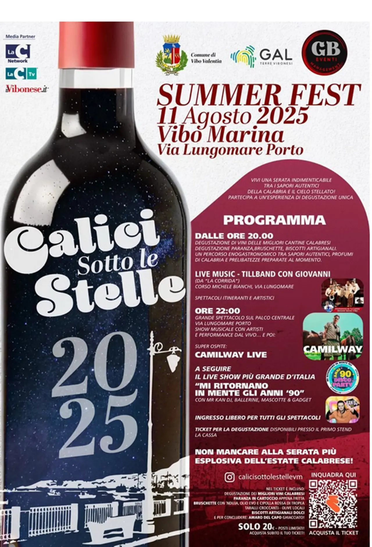 Proseguono gli eventi estivi organizzati dal Comune di Vibo Valentia. Tra gli appuntamenti più attesi dell’estate 2025 c’è “Calici sotto le stelle, Summer Fest” un percorso enogastronomico dove sarà possibile degustare paranza in cartoccio preparata al momento, bruschette con ‘Nduja e cipolla rossa di Tropea, taralli, olive e biscotti locali. Il tutto accompagnato dai vini delle migliori cantine calabresi e dall’immancabile Amaro del Capo. Sulla pagina Instagram Calicisottolestelllevm è possibile acquistare il ticket.