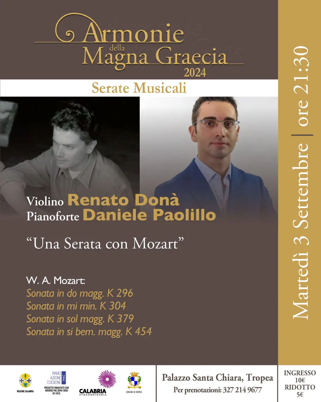 Ancora emozioni sotto le stelle con il Festival armonie della Magna Graecia. Martedì 3 settembre il suggestivo borgo di Tropea si trasformerà ancora una volta in un palcoscenico d’eccezione per una serata di musica classica, arte e bellezza. L’ex monastero di Santa Chiara ospiterà alle ore 21:30 l’evento dal titolo Una serata con Mozart con il violinista Renato Donà e il pianista Daniele Paolillo, due interpreti di grande talento che condurranno il pubblico in un raffinato viaggio attraverso le opere di Wolfgang Amadeus Mozart.
