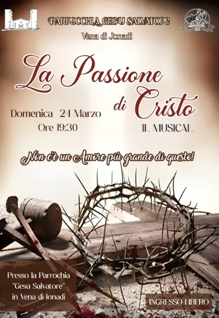 Nell’ambito delle iniziative pasquali, la parrocchia Gesù Salvatore di Vena di Jonadi – guidata da don Roberto Carnovale – promuove il musical “La passione di Cristo”. L’appuntamento è in programma il 24 marzo alle ore 19.30 e vanta la partecipazione di 70 tra cantati, attori e figuranti. Previsto il contributo dei parrocchiani (circa 100 persone tra bambini, giovani, adulti) e la presenza di seminaristi e membri del clero tra diaconi e presbiteri. La regia è affidata alla maestra Antonella Furfaro della scuola d’arte “Armus Lab”. Hanno contribuito all’allestimento del musical: la pro loco Jonadi, le comunità di Pannaconi, Favelloni e San Giovanni di Zambrone. Tra i personaggi principali figurano: narratore (don Roberto), Gesù (diacono Filippo Emanuele Grillo), Maria Madre di Gesù (Antonella Furfaro), Giovanni (presbitero Gerardo Furlano), Maria Maddalena (Lucia Cambareri), Pilato (Danilo Palermo), Giuda (Vincenzo Barbieri), Veronica (Lucia Caparra), Cireneo (Marcello Svarmato). Hanno lavorato alla perfetta uscita della sacra rappresentazione: Eugenio Rossi (scenografo), il gruppo collaboratrici parrocchiali (abiti) e Antonella Corso della sartoria “Creo e taglio”.