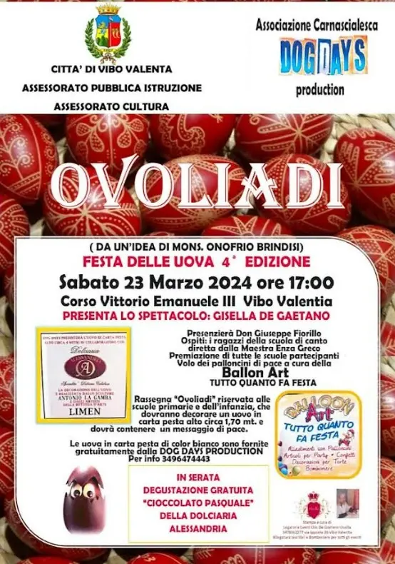 L’Amministrazione comunale di Vibo Valentia e l’Associazione carnascialesca Dogdays presentano la quarta edizione di Ovoliadi, la festa delle uova. L’iniziativa, che interesserà corso Vittorio Emanuele III, prevede momenti di spettacolo, degustazioni di cioccolato pasquale. L’appuntamento, presentato da Gisella De Gaetano, prevede l’adesione di don Giuseppe Fiorillo. Tra gli ospiti: i ragazzi della scuola di canto diretta dalla maestra Enza Greco. Durante l’evento si terrà anche la premiazione delle scuole aderenti. Inizio alle ore 17.00.