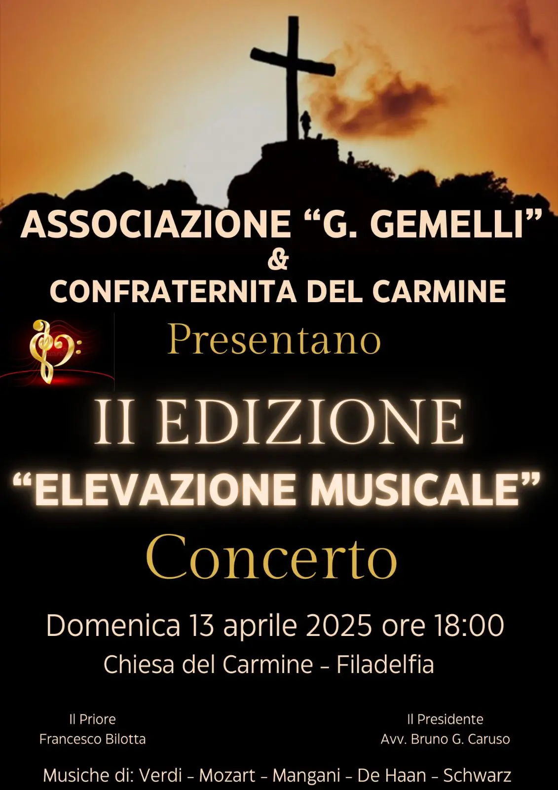 Si svolgerà domenica nella Chiesa del Carmine di Filadelfia il concerto ”elevazione musicale”, giunto alla sua seconda edizione, proposto dall’orchestra di fiati ”Giovanni Gemelli” in preparazione della Pasqua che si inserirà anche nell’ambito del Giubileo. «Il concerto – si legge nella nota stampa di presentazione dell’evento – rappresenta un’importante occasione di riflessione spirituale attraverso la musica, offrendo un programma ricco e variegato che spazia dalla musica sacra alla pietà popolare, con pagine originali per banda e trascrizioni di grandi pezzi sacri della storia musicale.